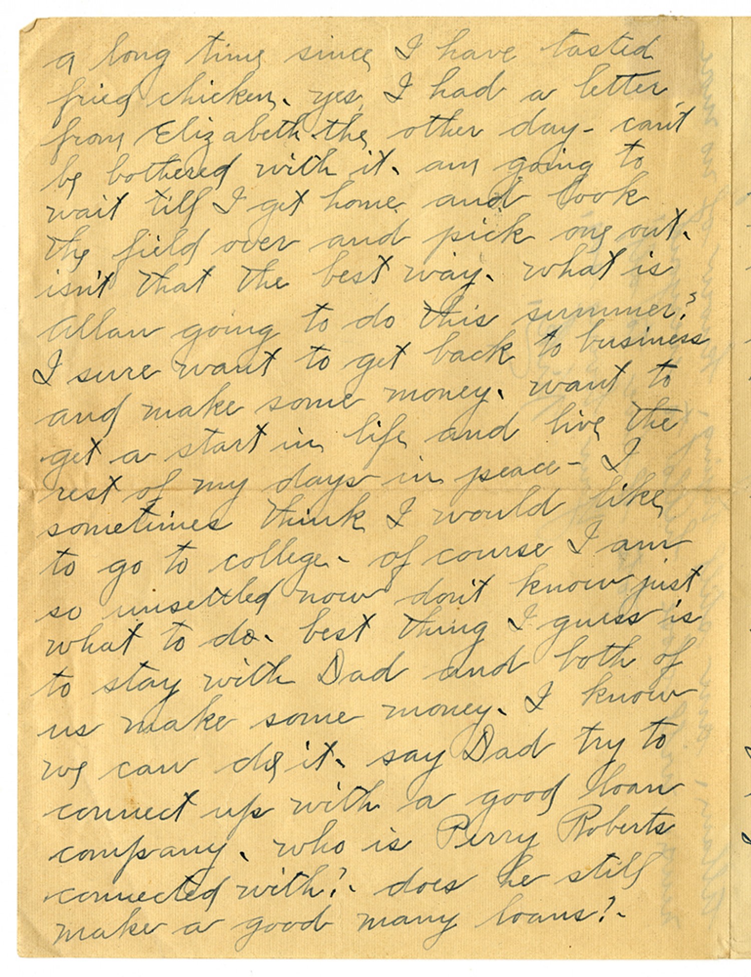 a long time since I have tasted fried chicken - yes, I had a letter from Elizabeth the other day - can't be bothered with it - am going to wait till I get home and look the field over and pick one out - isn't that the best way - what is Allan going to do this summer? I sure want to get back to business and make some money - want to get a start in life and live the rest of my days in peace - I sometimes think I would like to go to college - of course I am so unsettled now don't know just what to do - best thing I guess is to stay with Dad and both of us make some money - I know we can do it - say Dad try to connect up wit ha good loan company - who is Perry Roberts connected with? - does he still make a good many loans? -