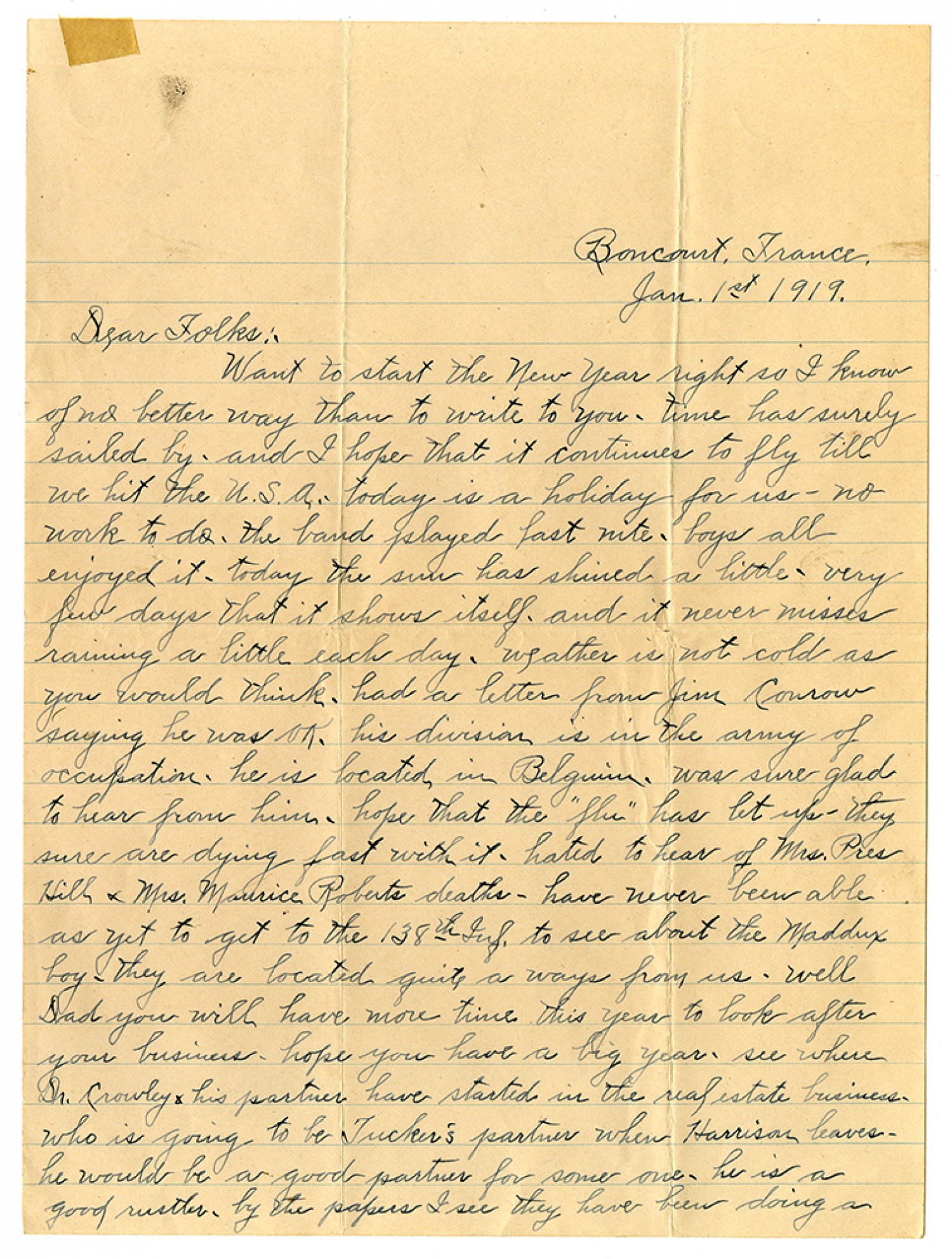 Boncourt, France, [January] 1st 1919. Dear Folks:- Want to start the New Year right so I know of no better way than to write to you - time has surely sailed by - and I hope that it continues to fly will we hit the U.S.A. - today is a holiday for us - no work to do - the band played last nite - boys all enojyed it - today the sun has shined a little - very few days that it shows itself - and it never misses rainng a little each day, wather is not cold as you would think, had a letter from Jim Conrow saying he was OK - his division is in the army of occupation - he is located in Belgium, was sure glad to hear from him - hope that the "flu" has let up - they sure are dying fast with it - hated to hear of Mrs. Pres Hill & Mrs. Maurice Roberts death - have never been able as yet to get to the 138th Inf. to see about the Maddox boy - they are located quite a ways from us - well Dad you will have more time this year to look after your business hope you have a big year - see where Dr. Crowley & his partner have started in the real estate business - who is going to be Tucker's partner when Harrison leaves - he would be a good partner for some one - he is a good rustler - by the papers I see they have been doing a