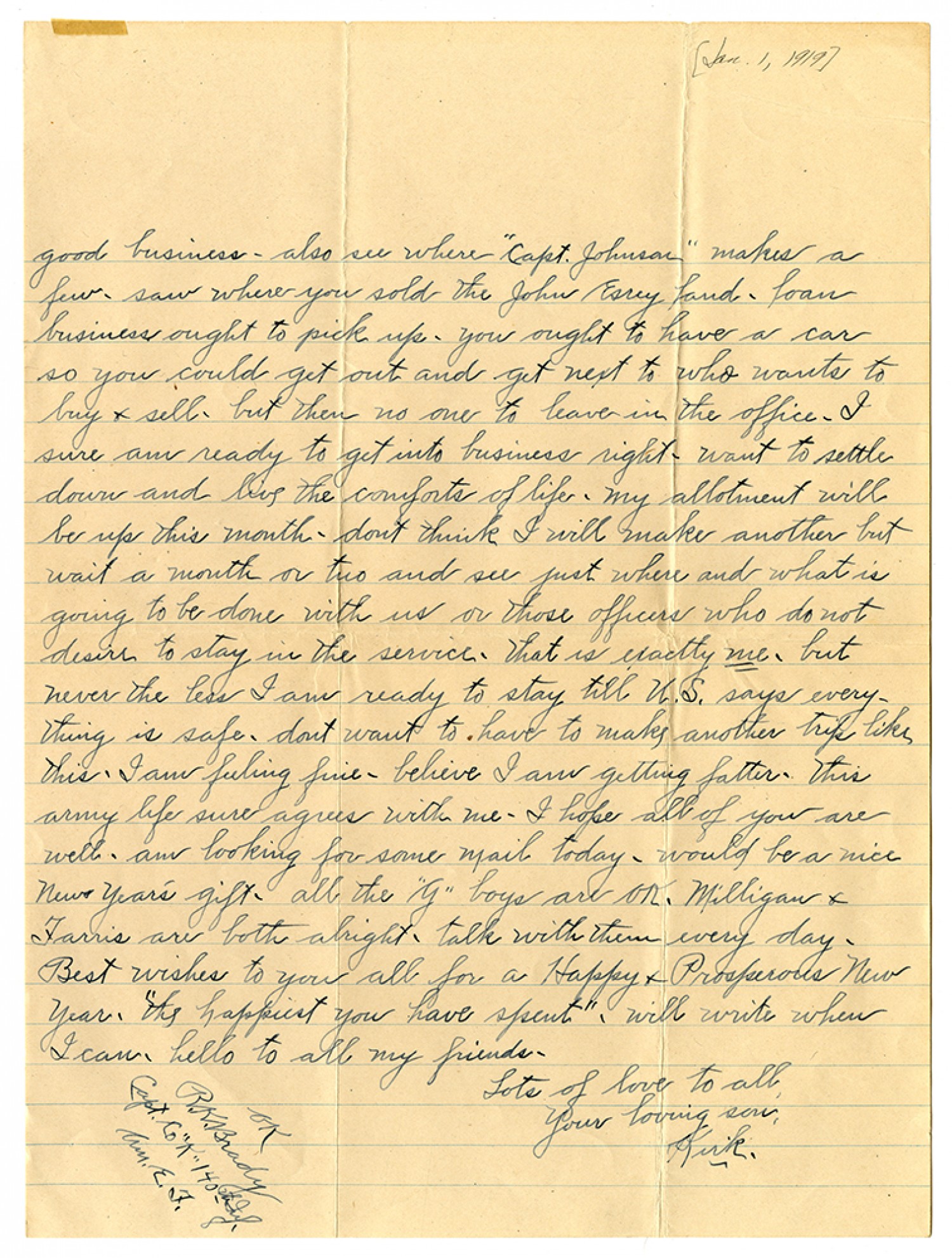 good business - also see where "Capt. Johnson" makes a few - saw where you sold the JOhn Esrey land - Loan business ought to pick up - you ought to have a car so you could get out and get next to who wants to buy & sell - but then no one to leave in the office - I sure am ready to get into business right - want to settle down and live the comforts of life - my allotment will be up this month - dont thin kI will make another but wait a month or two and see just where and what is going to be done with us or those officers who do not desire to stay in service - that is exactly me - but never the less I am ready to stay till U.S. says every-thing is safe - dont want to have to make another trip like this - I am feeling fine - believe I am getting fatter - this army life sure agrees with me - I hope all of you are well - am looking for some mail today - would be a nice New Year's gift - all the "G" boys are OK. Milligan & Farris are bot halright - talk with them every day - Best wishes to you all for a Happy & Prosperous New Year - "the happiest you have spent", will write when I can, hello to all my friends - Lots of love to all, your loving son, Kirk. OK R.K.Brady Capt. Co "K" 140th Inf. Am. E.F.