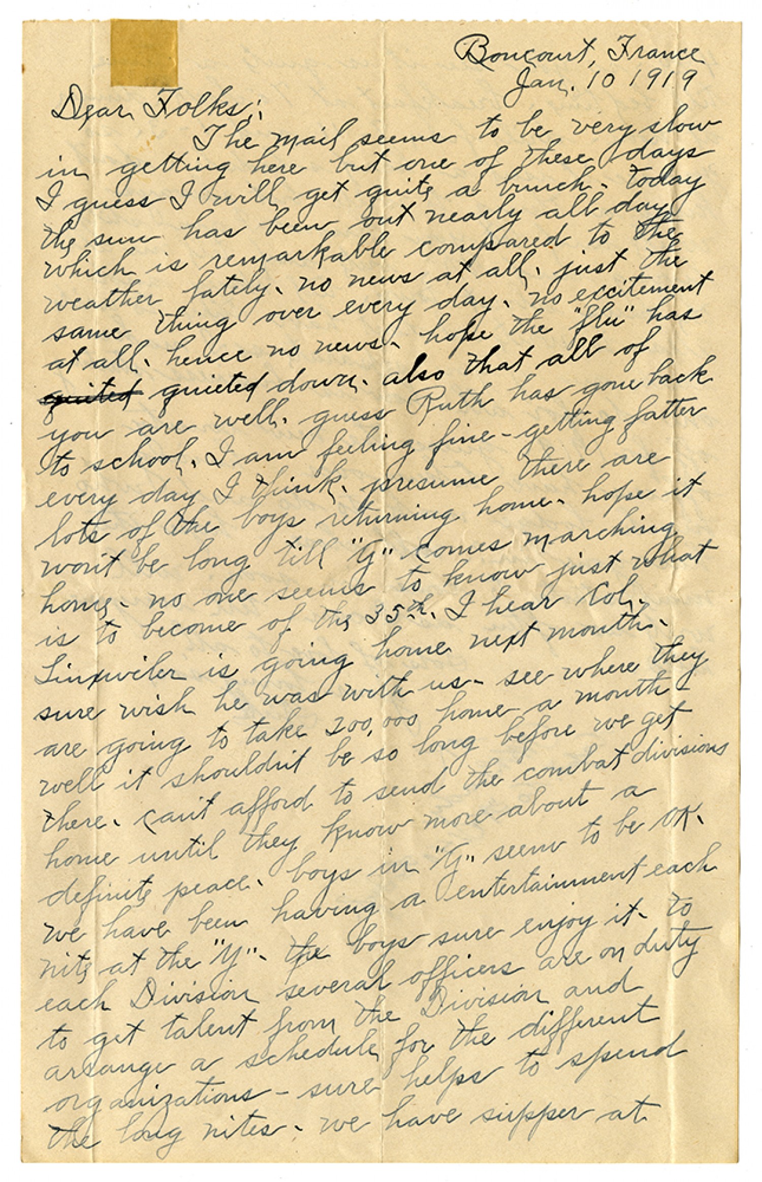 Boncourt, France [January] 10 1919 Dear Folks:- The mail seems to be very slow in getting here but one of these days I guess I will get quite a bunch - today the sun has been out nearly all day which is remarkable compared to the weather lately - no news at all - just the same thing over every day - no excitement at all - hence no news - hope the "flu" has quieted down - also that all of you are well. guess Ruth has gone back to school. I am feeling fine - hetting fatter every day I think - presume there are lots of the boys returning home - hope it won't be long till "G" comes marching home - no one seems to know just what is to become of the 35th - I hear Col. Linxwiler is going home next month - sure wish he was with us - see where they are going to take 200,000 home for a month well it shouldn't be so long before we get there - can't afford to send the combat divisions home until they know more about a definite peace - boys in "G" seem to be Ok - we have been having a entertainment each nite at the "Y" - the boys sure enjoy it - to each Division several officers are on duty to get talent from the Division and arrange a schedule for the different organizations - sure helps to spend the long nites - we have supper at