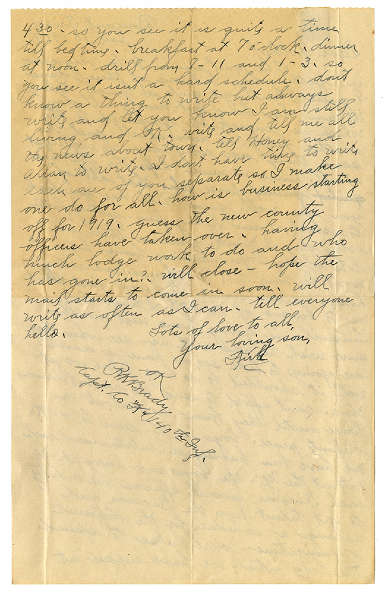 4 30 - so you see it is quite a time till bed time - breakfast at 7 o'clock - dinner at noon - drill from 8-11 and 1-3 - so you see it isn't a hard schedule, don't know a thing to write but always write and let you know I am still living and OK - write and tell me all the news about town - tell Honey and Allan to write - I dont have time to write each one of you separate so I make one do for all - how is business starting off for 1919- guess the new country officers have taken over - having much lodge work to do and who has gone in? - will close - hope hte mail starts to come in soon - will write as often as I can - tell everyone hello, Lots of love to all, Your loving son, Kirk OK RkBrady Cpt. Co "K" 140th Inf.