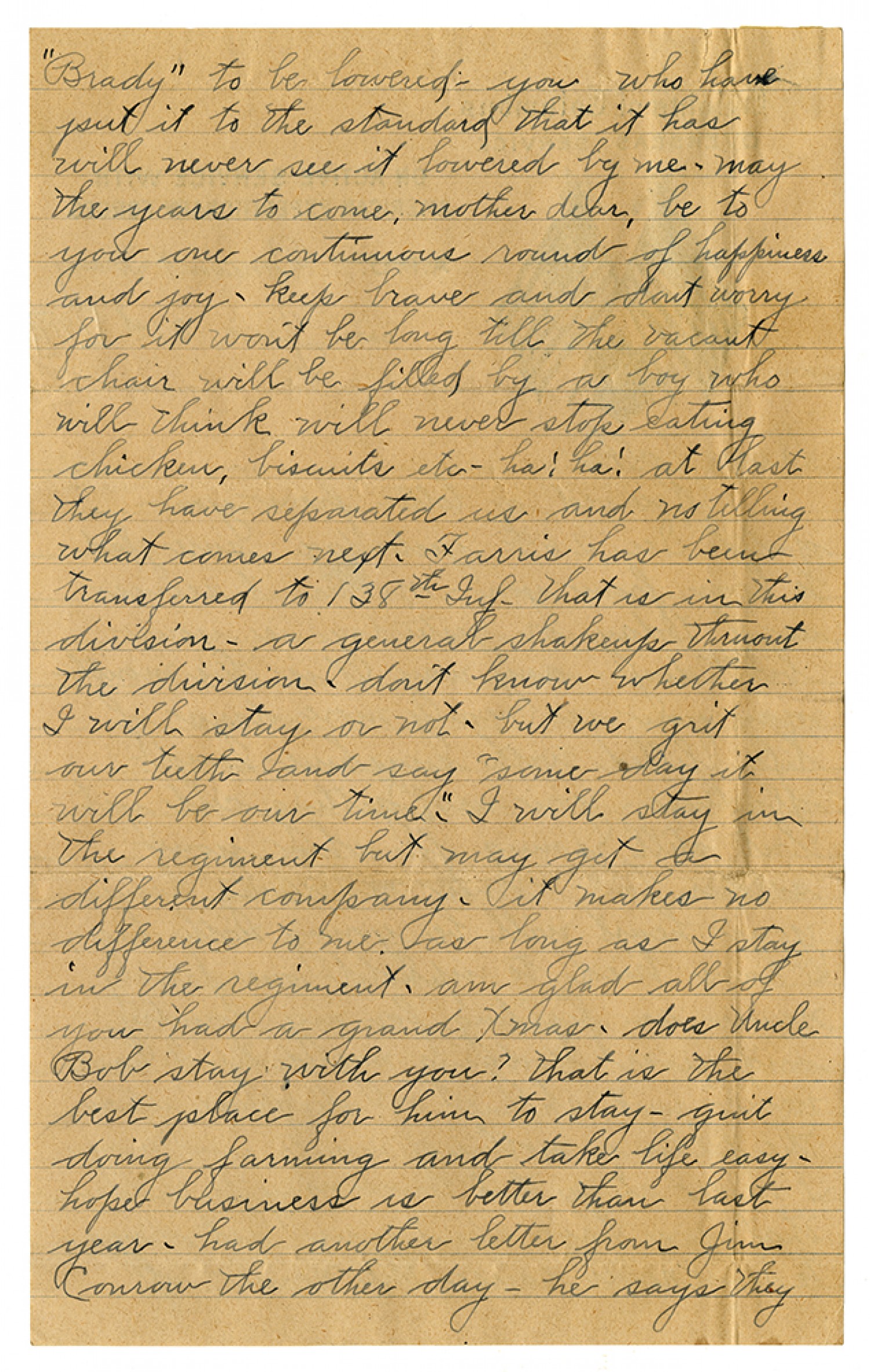 "Brady" to be lowered - you who have put it to the standard that it has will never see it lowered by me - may the years to come, Mother dear, be to you one continuous round of happiness and joy - keep brave and ont worry for it won't be long till the vacant chair will be filled by a boy who will think will never stop eating chicken, biscuits etc - ha! ha! at last they have separated us and no telling what comes next - Farris has been transferred to 138th Inf. that is in this division - a general shakeup thruout the division - don't know whether I will stay or not - but we grit our teeth and say "some day it will be our time"- I will sty in the regiment but may get a different company - it makes no difference to me as long as I stay in the regiment - am glad all of you had a grand Xmas - does Uncle Bob stay with you? that is the best place for him to stay - quit doing farming and take life easy - hope business is better than last year - had another letter from Jim Conrow the other day - he says they