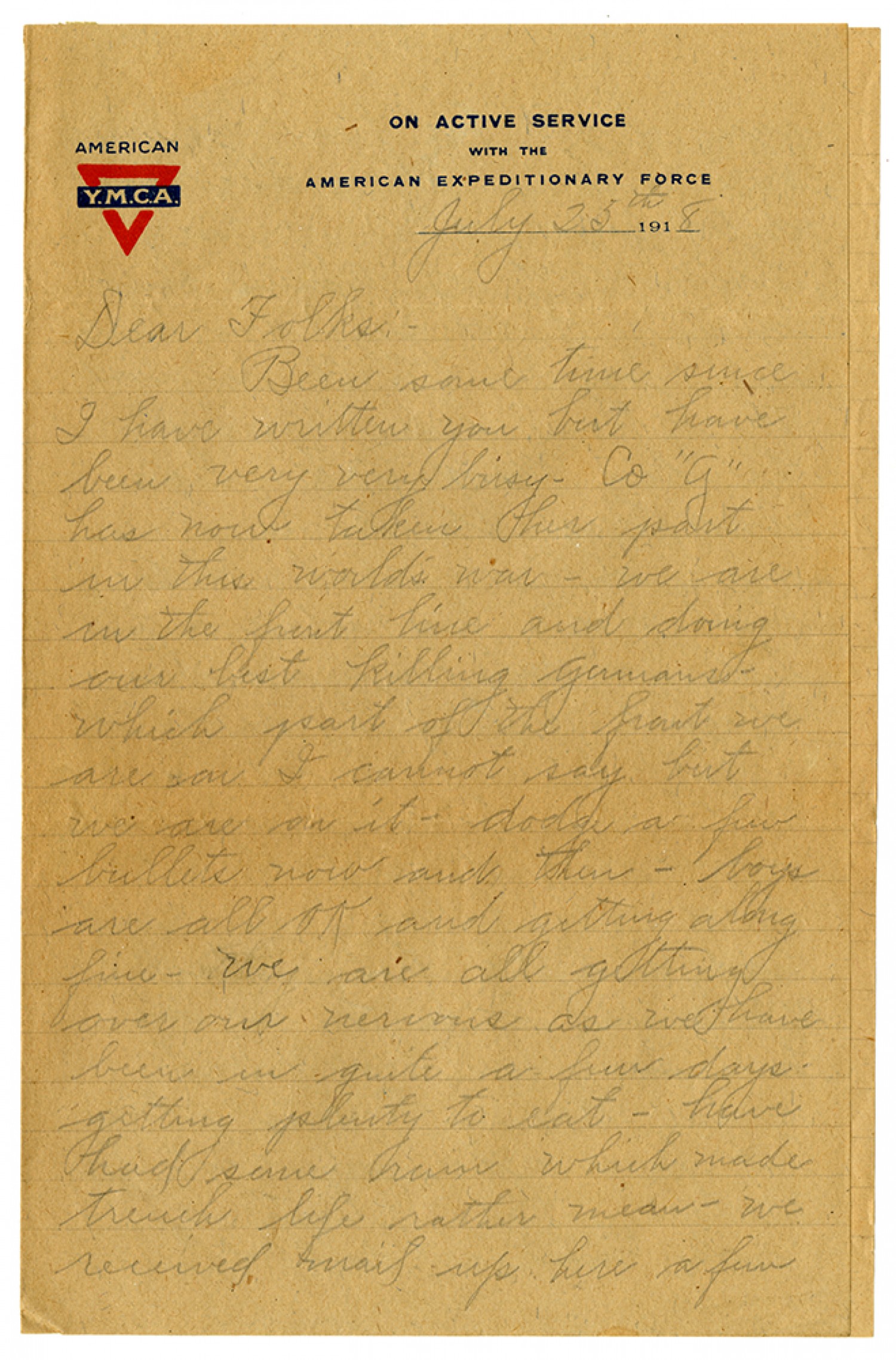 July 25th 1918 Dear Folks:- Been some time since I have written you but have been very busy- Co "G" has now taken his part in this world's war - we are in the front line and doing our best killing Germans- which part of the font we are on I cannot say but we are on it - dodge a few bullets now and then - boys are all OK and getting along fine - we are all getting over our nervous as we have been in quite a few days - getting plenty to eat - have had some rain which made trench life rather mean - we received mail up here a few