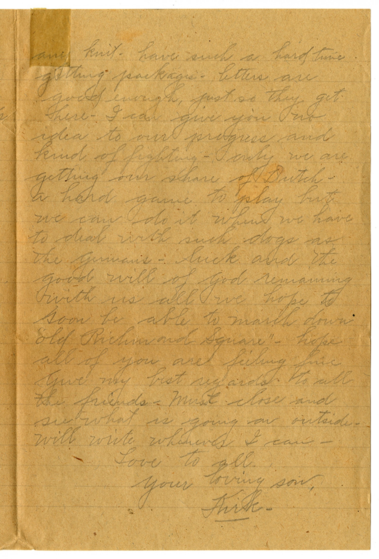 any knit. have such a hard time getting packages. letters are good enough, just so they get here - I can give you no idea to our progress and kind of fighting - only we are getting our share of Dutch - a hard game to play but we can do it when we have to deal with such dogs as the Germans - luck and the good will of God remaining with us all we hope to soon be able to march down "old Richmond Square"- hope all of you are feeling fine Give my best regards to all the friends - Must close and see what is going on outside - will write whenever I can - Love to all Your loving son, Kirk.