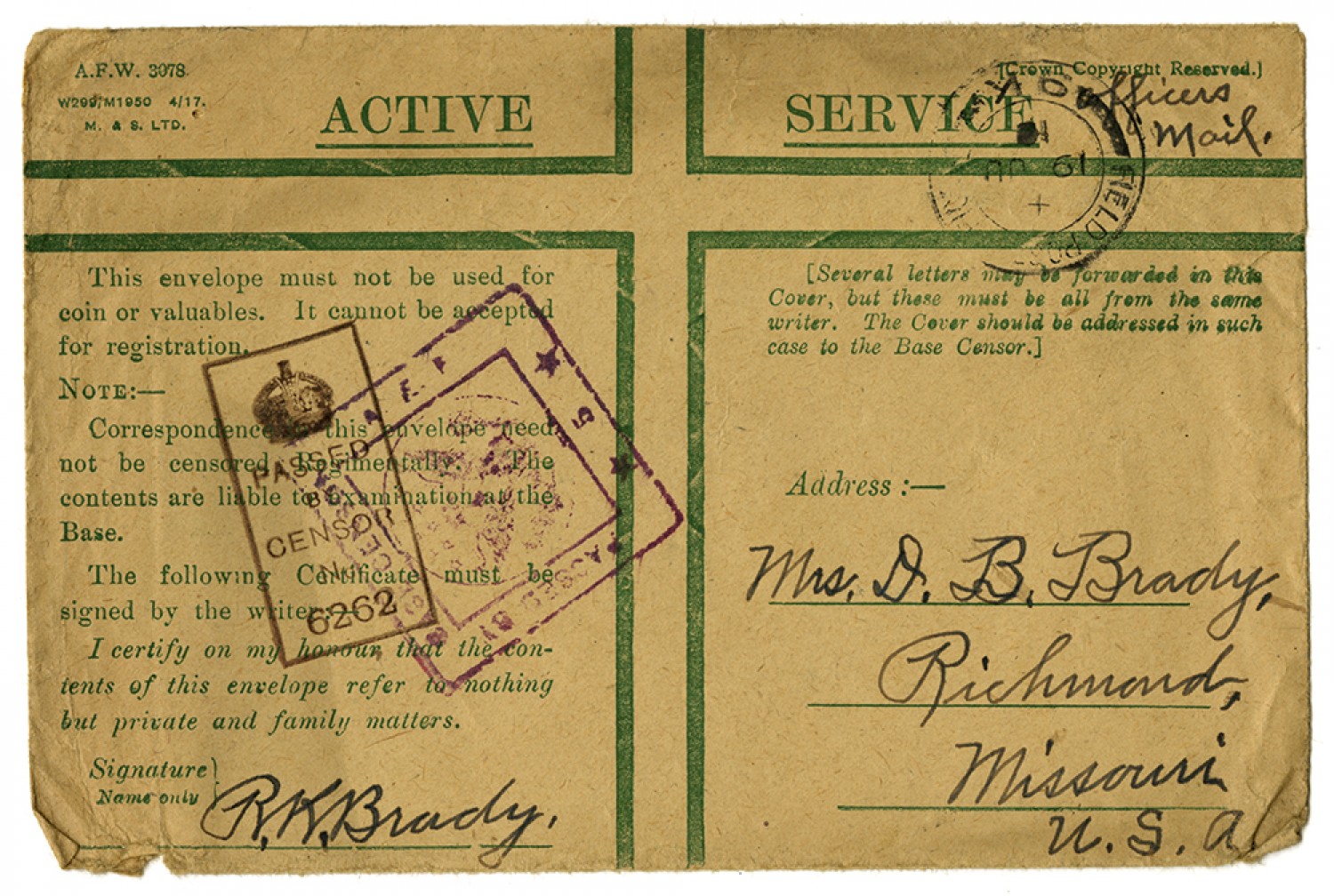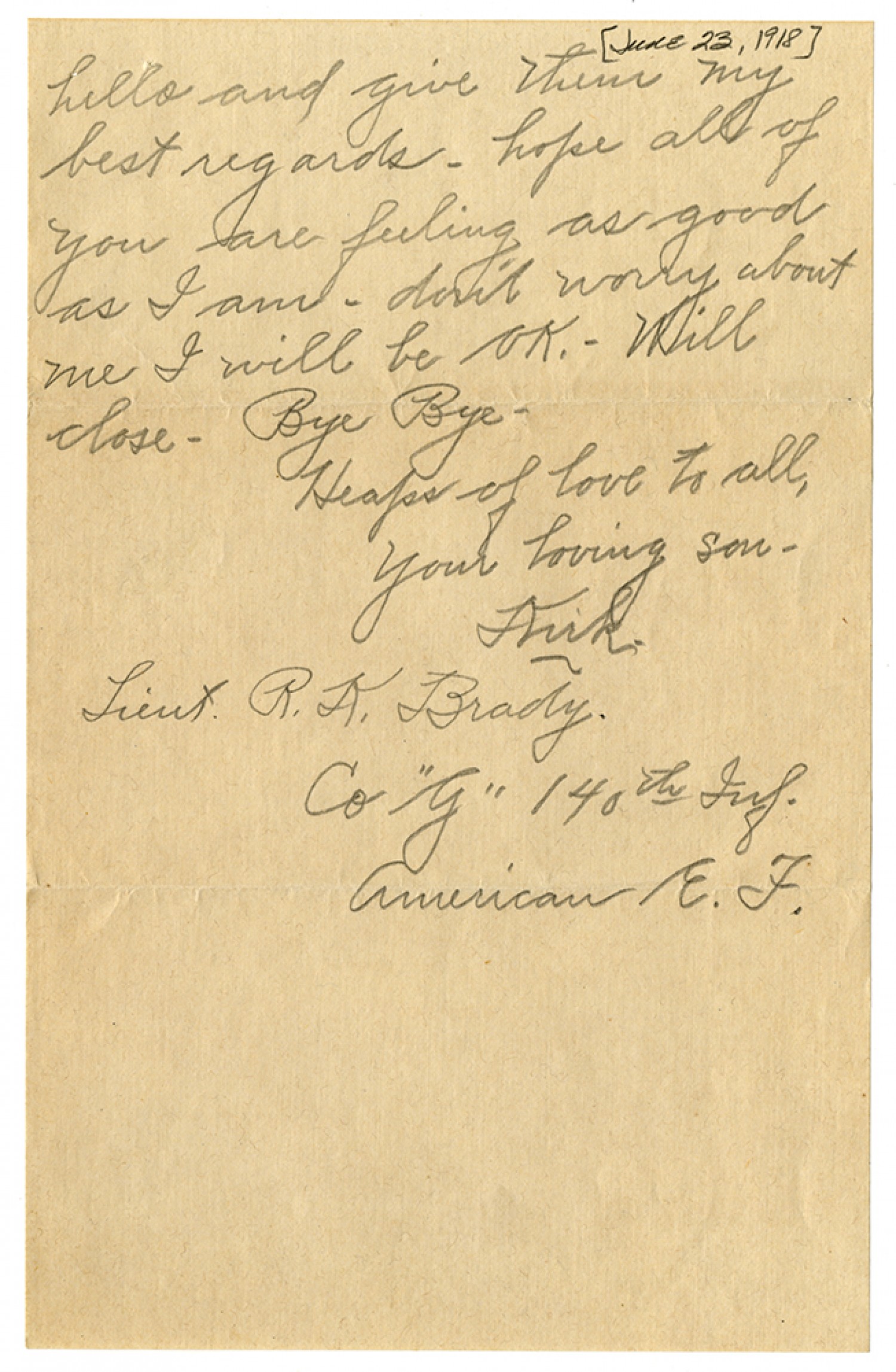 hello and give them my best regards - hope all of you are feeling as good as I am - don't worry about me I will be OK. - Will close - Bye Bye - Heaps of love to all, Your loving son - Kirk. Lieut. R.K. Brady. Co "G" 140th Inf. American E. F.