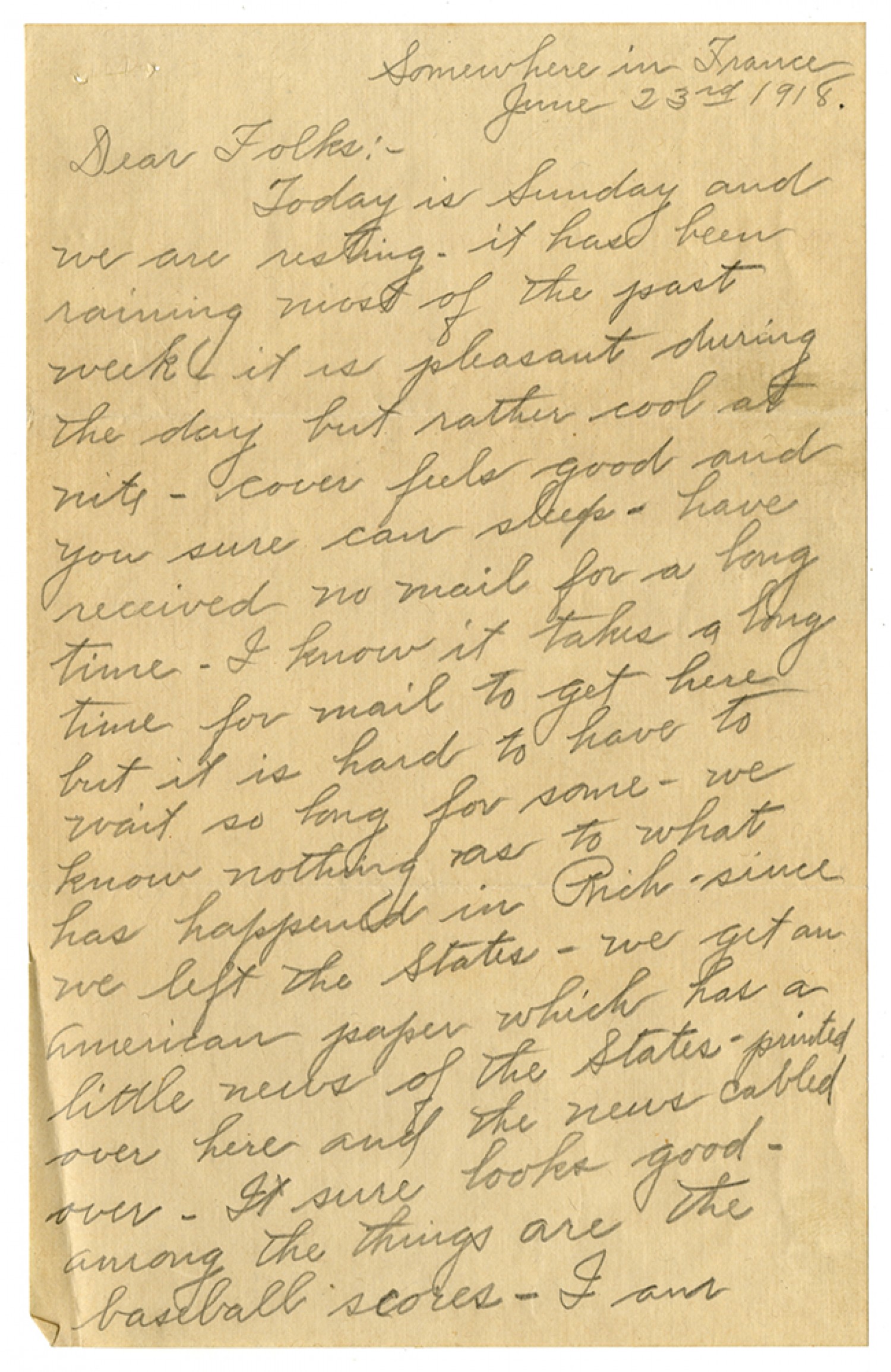 Somewhere in France June 23rd 1918. Dear Folks:- Today is Sunday and we are resting. it has been raining most of the past week . it is pleasant during the day but rather cool at nite - cover feels good and you sure can sleep - have received no mail for a long time - I know it takes a long time for mail to get here but it is hard to have to wait so long for some - we know nothing as to what has happened in Rich - since we left the States - we get an American paper which has a little news of the States - printed over here and the news cabled over - It sure looks good - among the things are hte baseball scores - I am