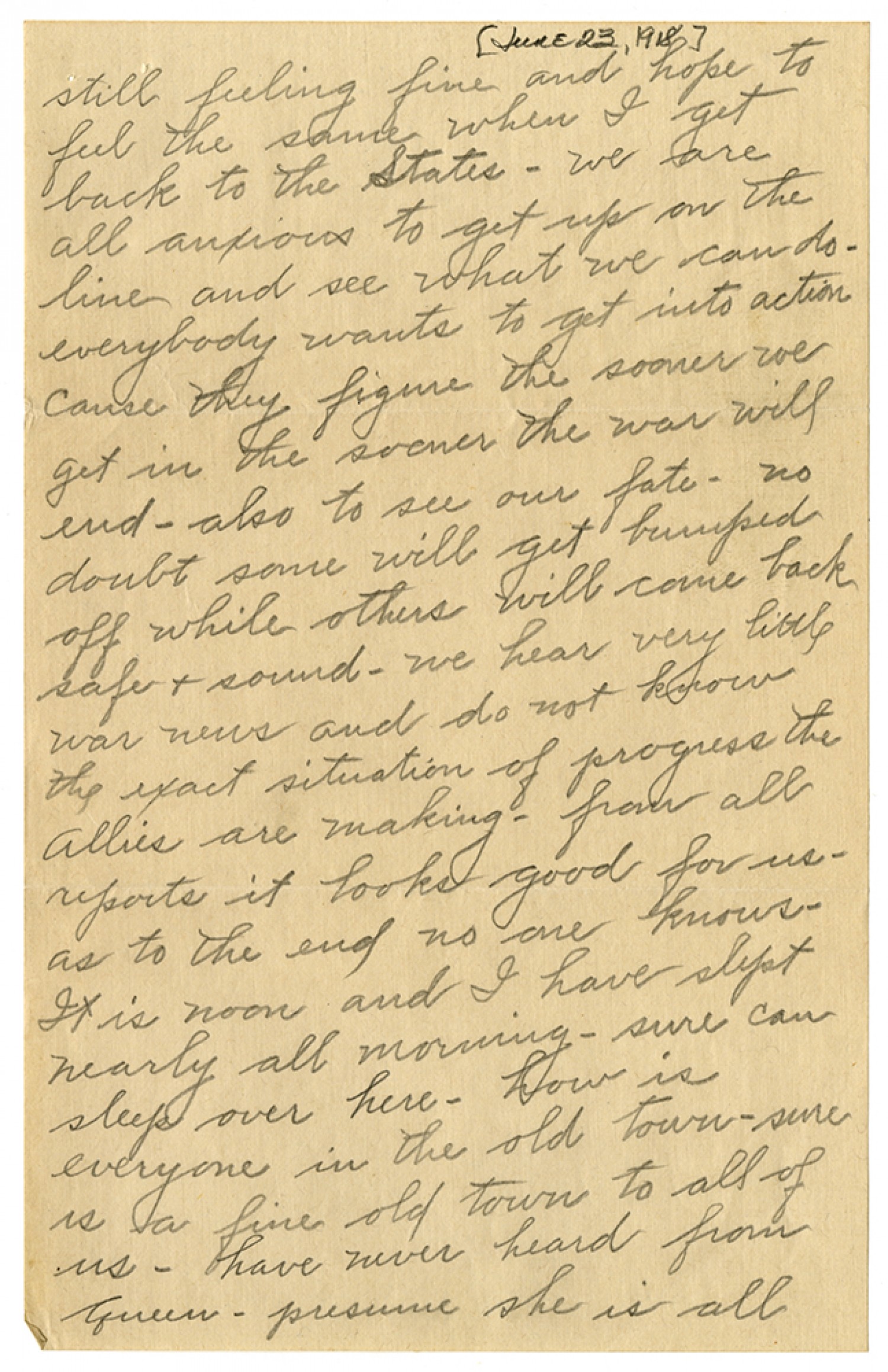 still feeling fine and hope to feel the same when I get back to the States - we are all anxious to get up on the line and see what we can do - everybody wants to ge tinto action cause they figure the sooner we get in the sooner the war will end - also to see our fate - no doubt some will ge tbumped off while others will come back safe & sound - we hear very little war news and do not know the exact situation of progress the Allies are making - from all reports it looks good for us - as to the end no one knows - It is noon and I have slept nearly all morning- sure can sleep over here - how is everyone in the old town - sure is a fine old town to all of us - have never heard from Queen - pressure she is all