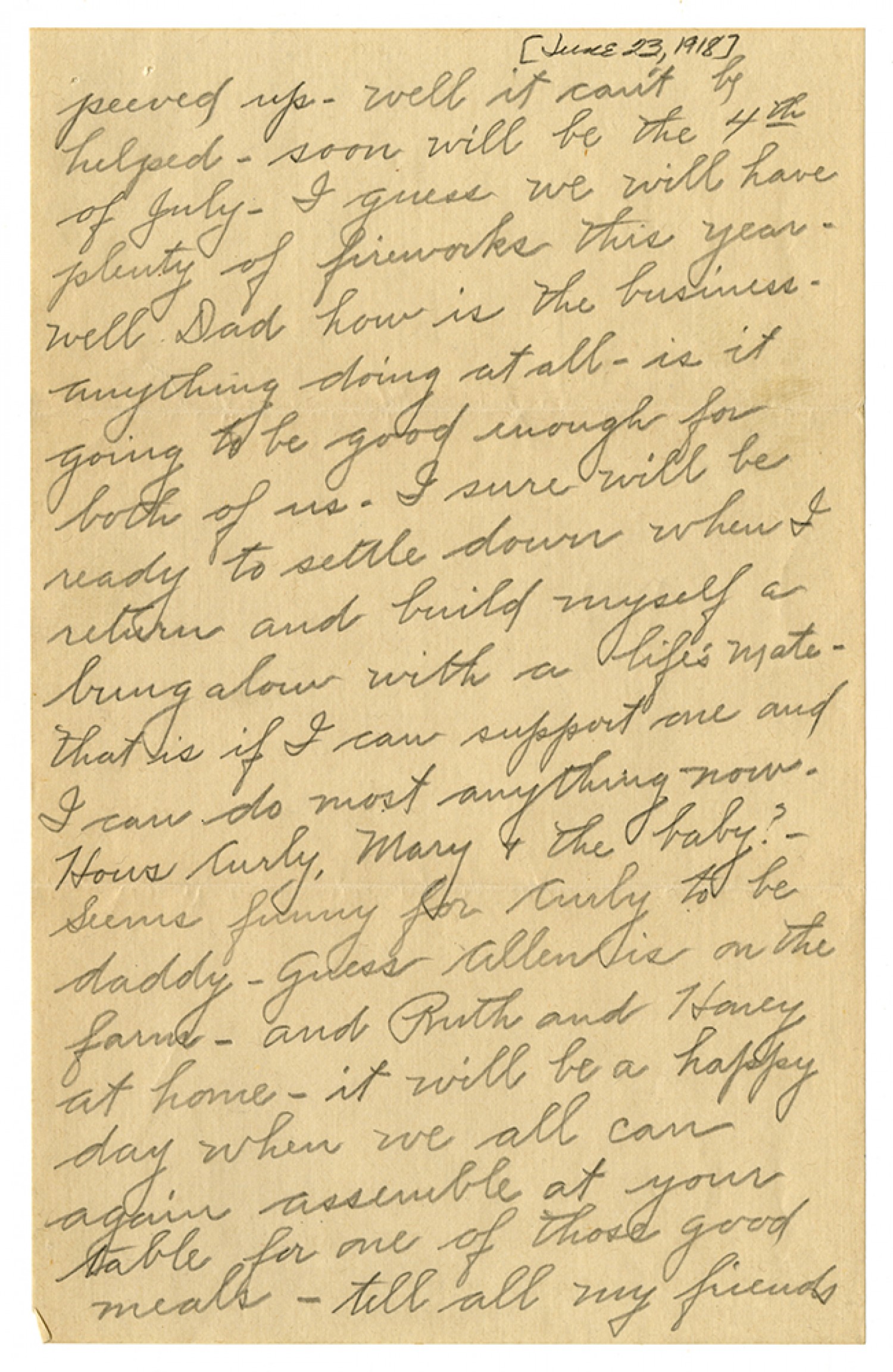 peeved up- well it can't be helped - soon will be the 4th of July - I guess we will have plenty of fireworks this year - well Dad how is the business - anything doing at all - is it going to be good enough for both of us - I sure will be ready to settle down when I return and build myself a bungalow with a life's mate - that is if I can support one and I can do most anything now. Hows Curly, Mary & the baby? - Seems funny for Curly to be daddy - Guess Allen is on the farm - and Ruth and Honey at home - it will be a happy day when we all can again assemble at your table for one of those good meals - tell all my friends