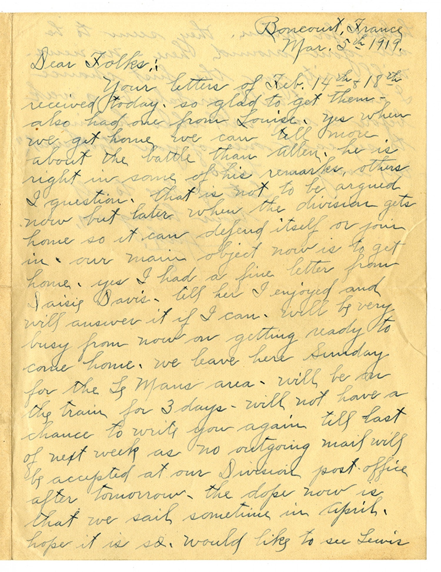 Boncourt, France [March] 5th 1919. Dear Folks: - Your letters of [February] 14th & 18th received today - so glad to get them - also had one from Louise - yes when we get home we can tell more about the battle than Allen - he is right in some of his remarks, other I question - that is not to be argued now but later when the division gets home so it can defend itself or join in - our main object now is to get home - yes I had a fine letter from Daisie Davis - tell her I enjoyed and will answer it if I can - will be very busy from now on getting ready to come home -we leave here Sunday for the Le Mans area - will be on the train for 3 days - will not have a chance to write you again till last of next week as no outgoing mail will be accepted at our Divisional post office after tomorrow - the dope now is that we sail sometime in April - hope it is so - would like to see Lewis