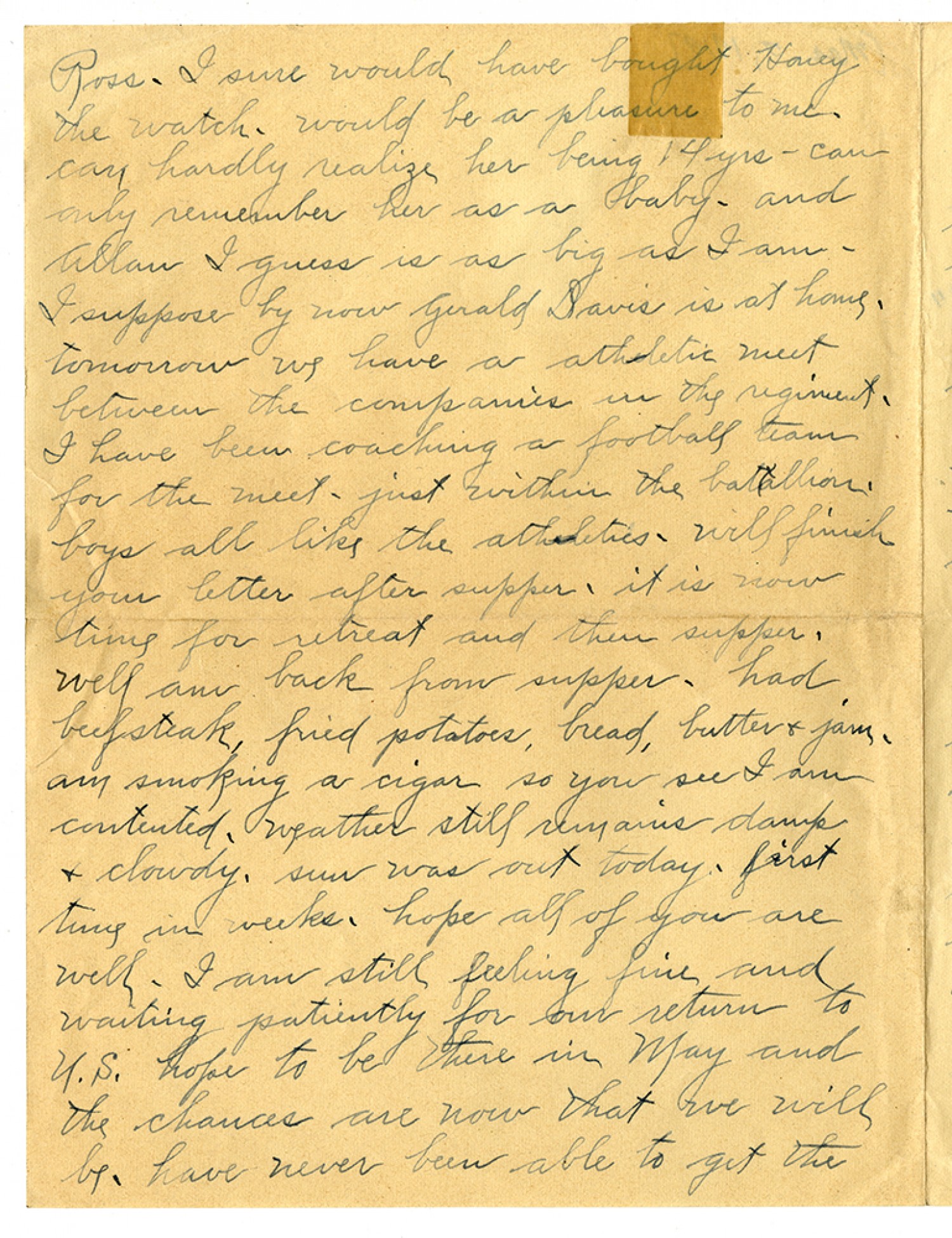 Ross - I sure would have bought Honey the watch - would be a pleasure to me - can hardly realize her being 14 yrs - can only remember her as a baby - and Allan I guess is as big as I am - I suppose by now Gerald Davis is at home - tomorrow we have a athletic meet between the companies in the regiment - I have been coaching a football team for the meet - just within the battallion - boys all like the athletics - will finish your leter after supper - it is new time for retreat and then supper - well am back from supper - had beefsteak, fried potatoes, bread, butter & jam - am smoking a cigar so you see I am contented - weather still remains damp & cloudy. sun was out today - first time in weeks, hope all of you are well - I am still feeling fine and waiting patiently for our return to U.S. hope to be there in May and the chances are now that we will be - have never been able to get the
