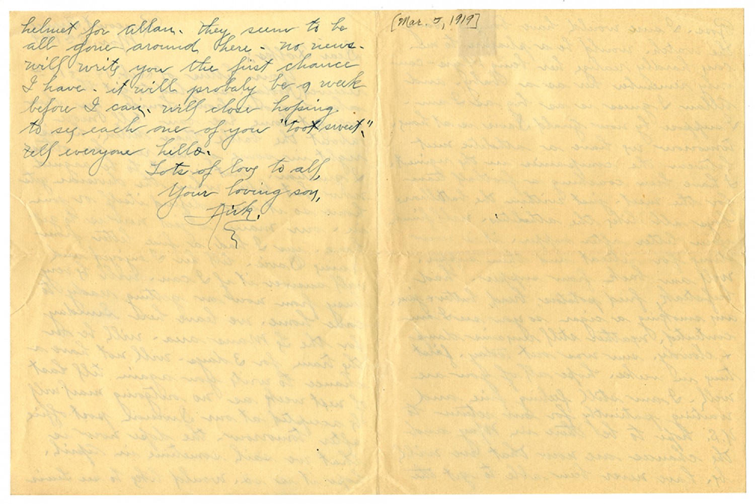 helmet for Allan - they seem to be all gone around here - no news - will write you the first chance I have - it will probaly be a week before I can - will close hoping to see each one of you "toot sweet," tell everyone hello - Lots of love to all, Your loving son, Kirk.
