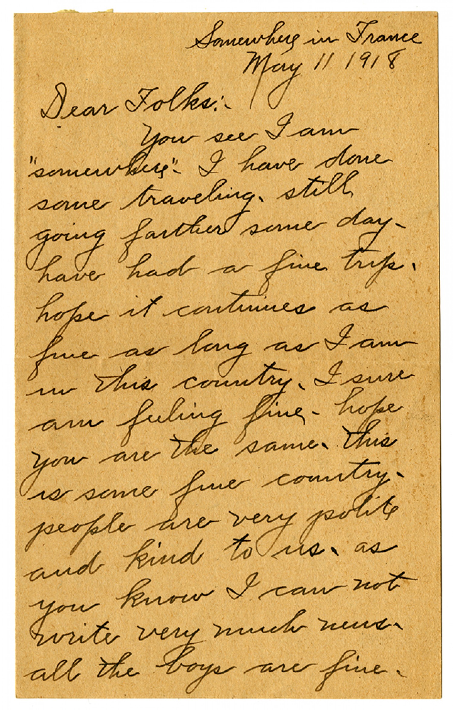 Somewhere in France May 11 1918 Dear Folks:- You see I am "somewhere" - I have done some traveling - still going farther some day - have had a fine trip, hope it continues as fine as long as I am in this country. I sure am feeling fine - hope you are the same. this is some fine country. people are very polite and kind to us. as you know I can not write very much news- all the boys are fine -
