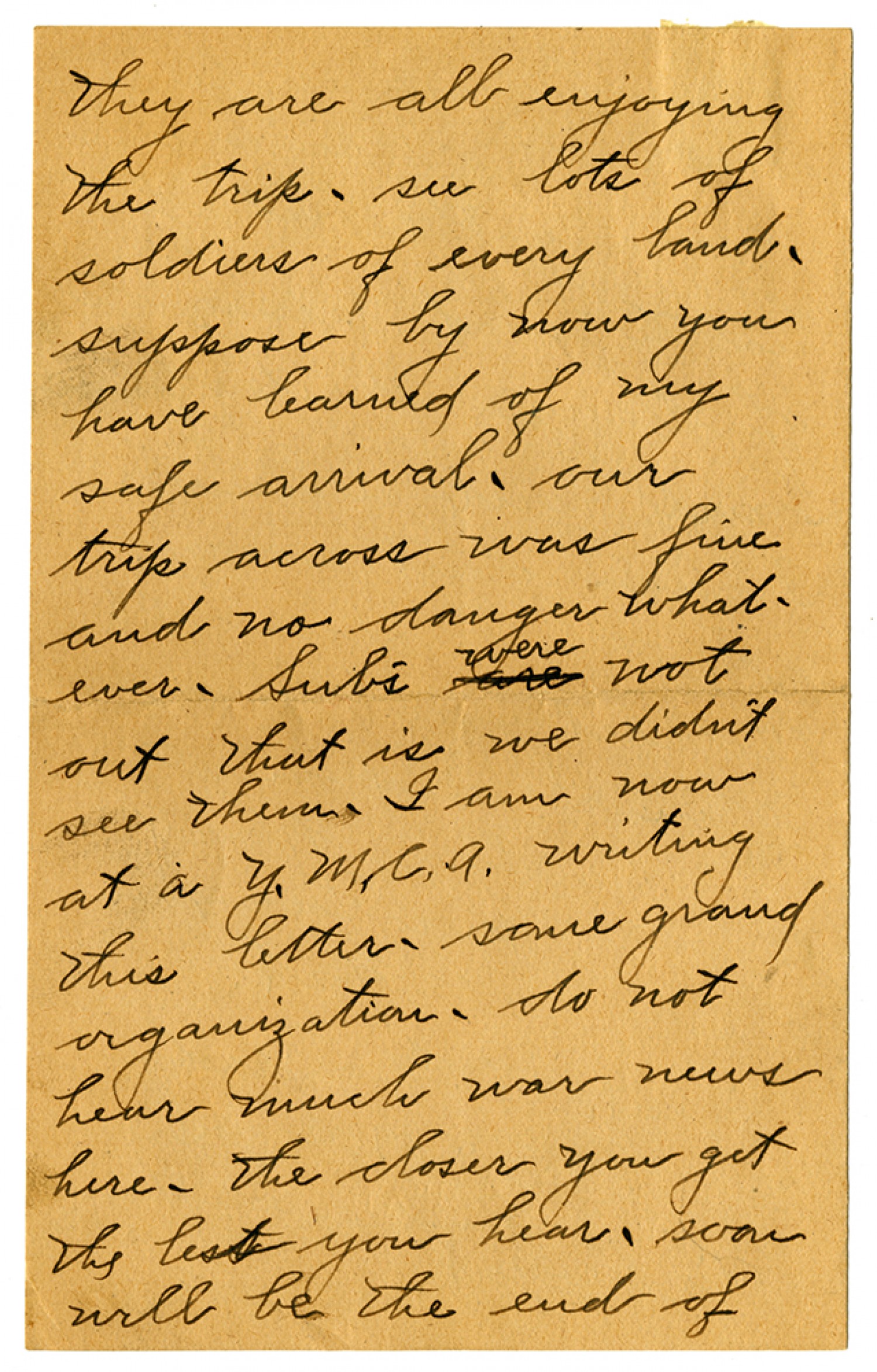 they are all enjoying the trip. see lots of soldiers of every land - suppose by now you ha ve learned of my safe arrival. our trip across was fine and no danger what-ever. Subs were not out that is we didn't see them. I am now at a Y.M.C.A. writing this letter - some grand organization. do not hear much war news here - the closer you get the lest you hear. soon will be the end of