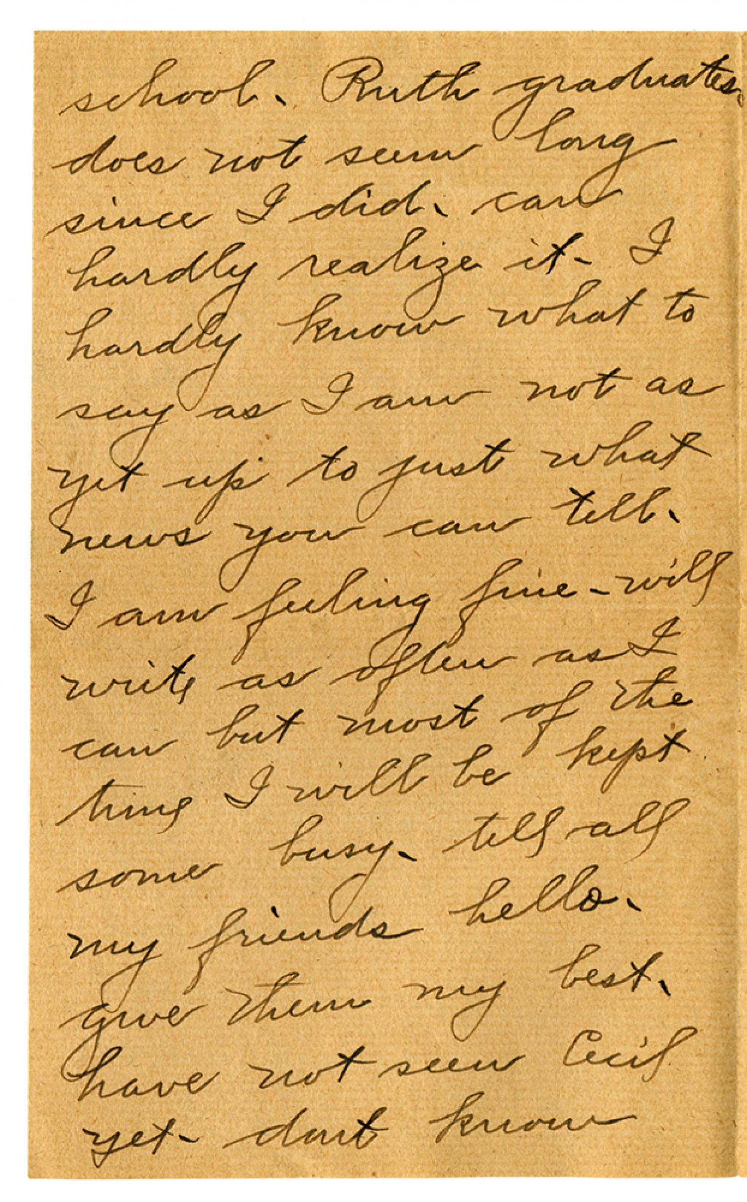 school. Ruth graduates does not seem long since I did. can hardly realize it. I hardly know what to say as I am not as yet up to just what news you can tell. I am feeling fine - will write as often as I can but most of the time I will be kept some busy - tell all my friends hello - give them my best - have not see nCecil yet - dont know