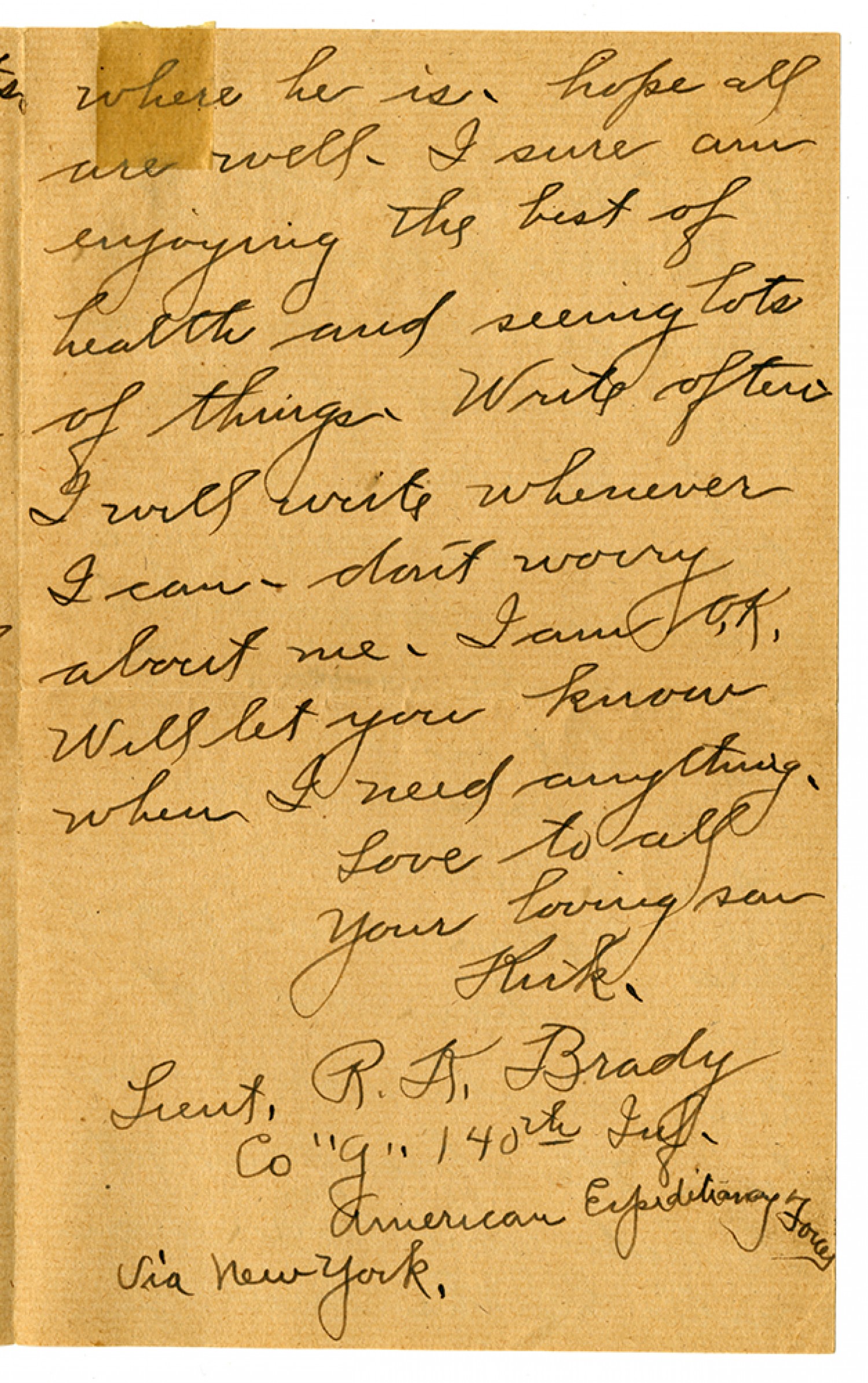 where he is. hope all are well. I sure am enjoying the best of health and seeing lots of things. Write often I will write whenever I can - don't worry about me - I am O.K. Well let you know when I need anything. Love to all Your loving son Kirk. Lieut. R.K. Brady Co "G" 140th Inf. American Expeditionary Forces via New York.