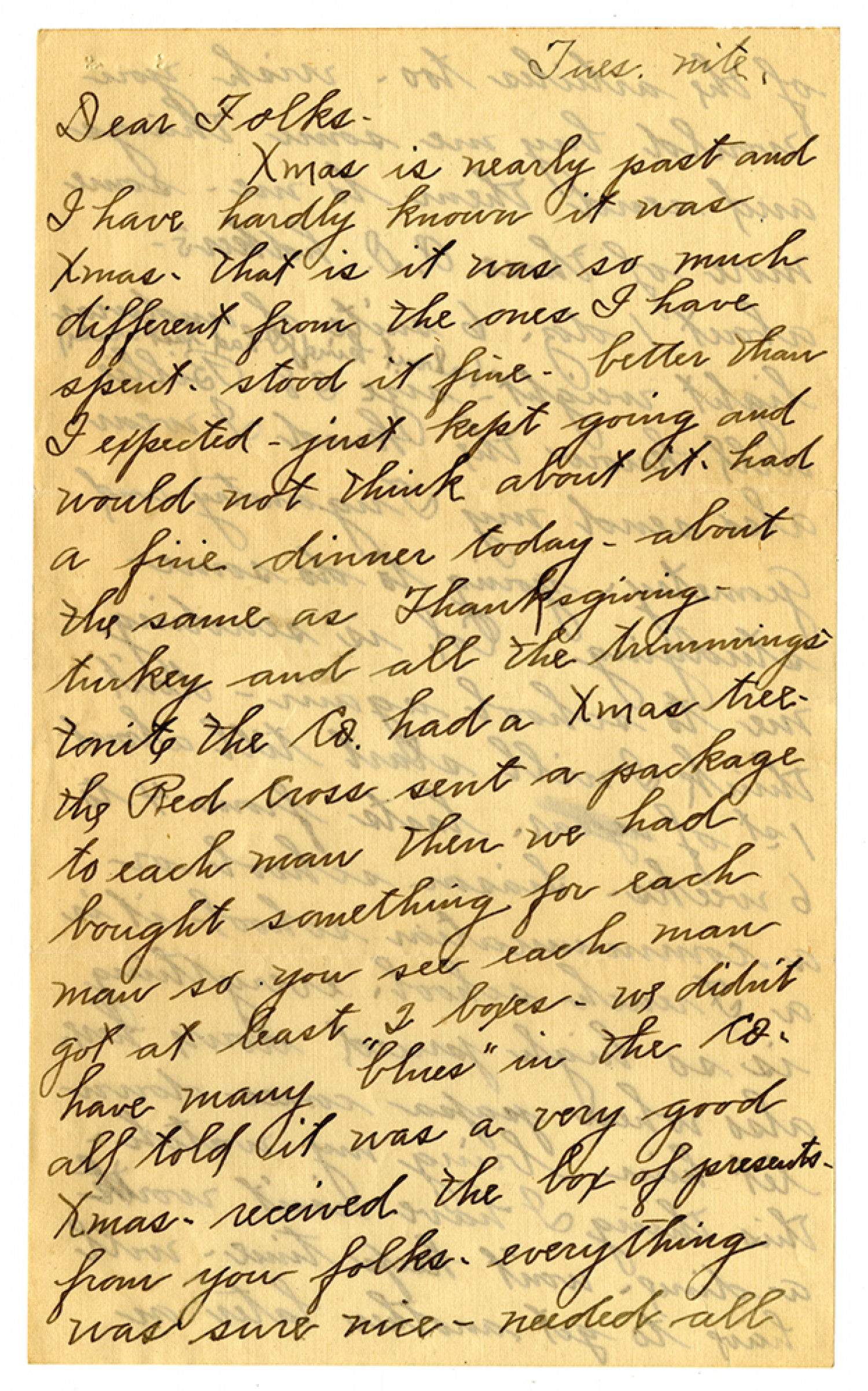 [Tuesday] nite. Dear Folks - Xmas is nearly past and I have hardly known it was Xmas - that is it was so much different from the ones I have spent. stood it fine. better than I expected - just kept going and would not think about it. had a fine dinner today - about the same as Thanksgiving - turkey and all the trimmings - tonite the Co. had a Xmas tree - the Red Cross sent a package to each man then we had bought something for each man so you see each man got at least 2 boxes - we didn't have many "blues" in the Co. all told it was a very good Xmas - received the box of presents - from you folks - everything was sure nice - needed all