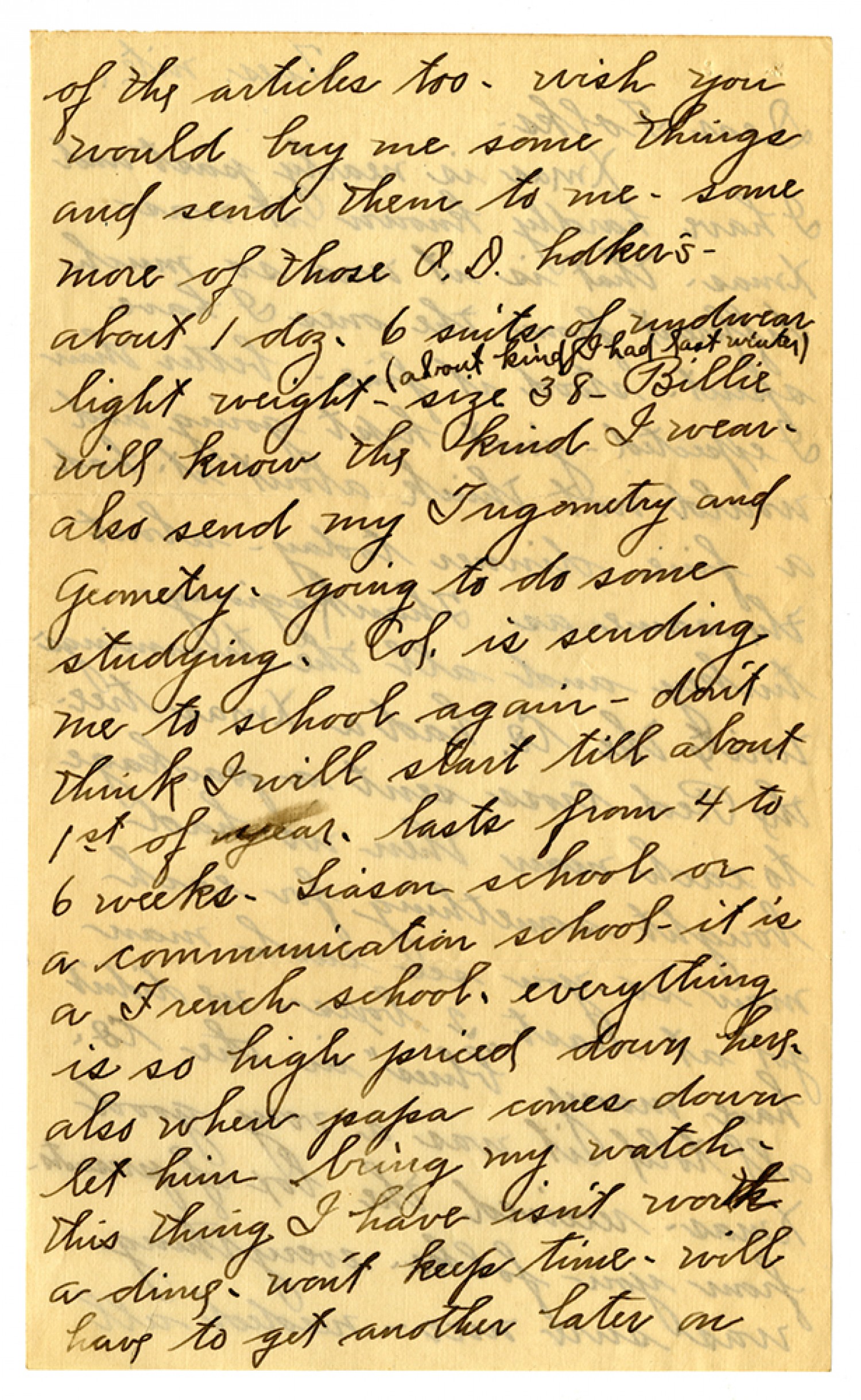 of the articles too - wish you would buy me some things and send them to me - some more of those O.D. holken's - about 1 doz. 6 suits of underwear light weight - size 38 - Billie willl know the kind I wear. also send my Trigometry and Geometry. going to do some studying. Col. is sending me to school again - don't think I will start till about 1st of year. lasts from 4 to 6 weeks. Liason school or a communication school - it is a French school. everything is so high priced down here. also when papa comes down let him bring my watch - this thing I have isn't worth a ding. won't keep time - will have to get another later on