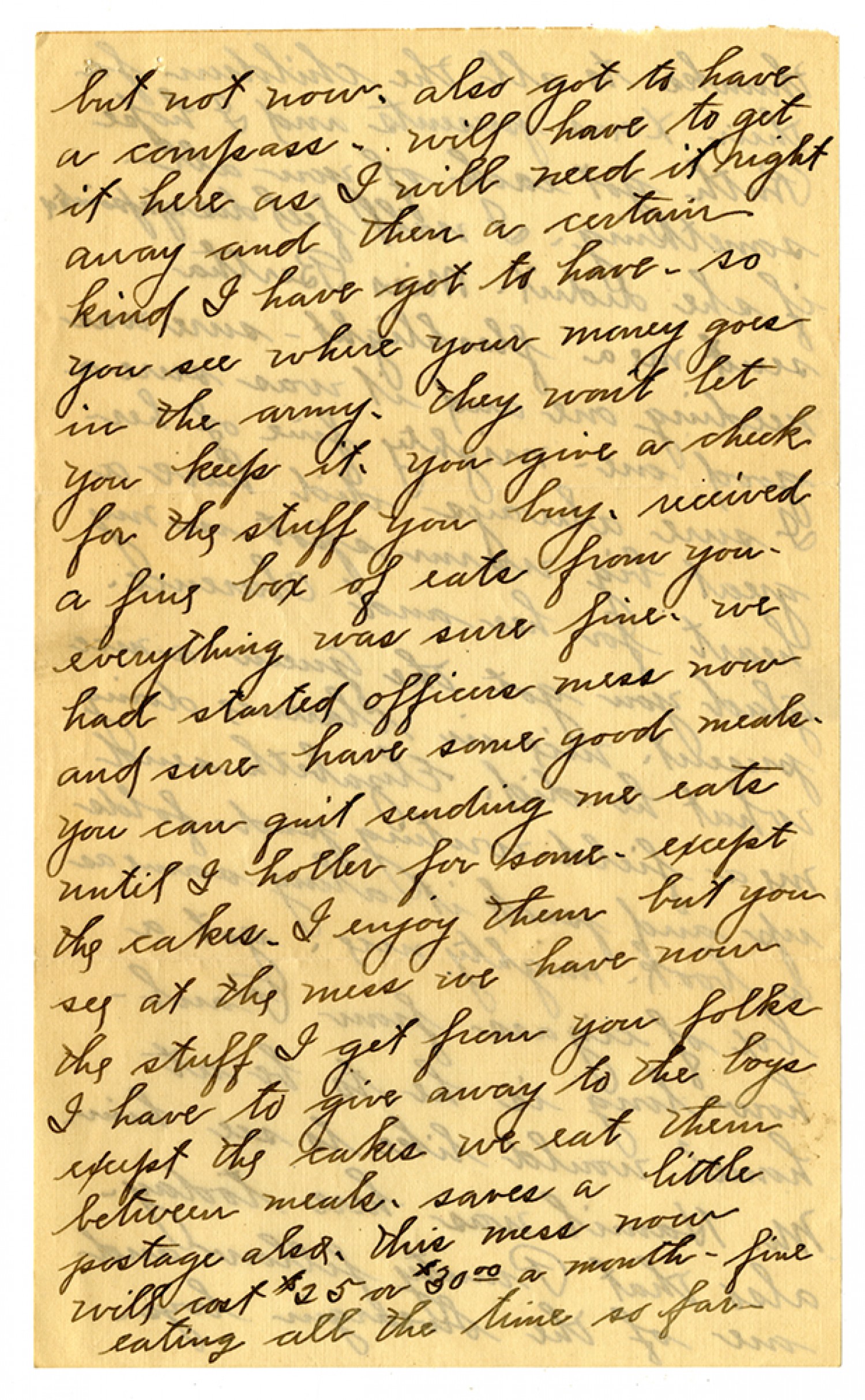 but not now. also got tohave a compass. will have to get it here as I will need it right away and then a certain kind I have got to have - so you see where your money goes in the army. they won't let you keep it. you give a check for the stuff you buy. received a fine box of eats from you - everything was sure fine. we had started officers mess now and sure have some good meals. you can quit sending me eats until I holler for some. except the cakes. I enjoy them but you see at the mess we have now the stuff I get from you folks I have to give away to the boys except the cakes we eat them between meals. saves a little postage also. this mess now will coast $25 or $30 00 a month - fine eating all the time so far -
