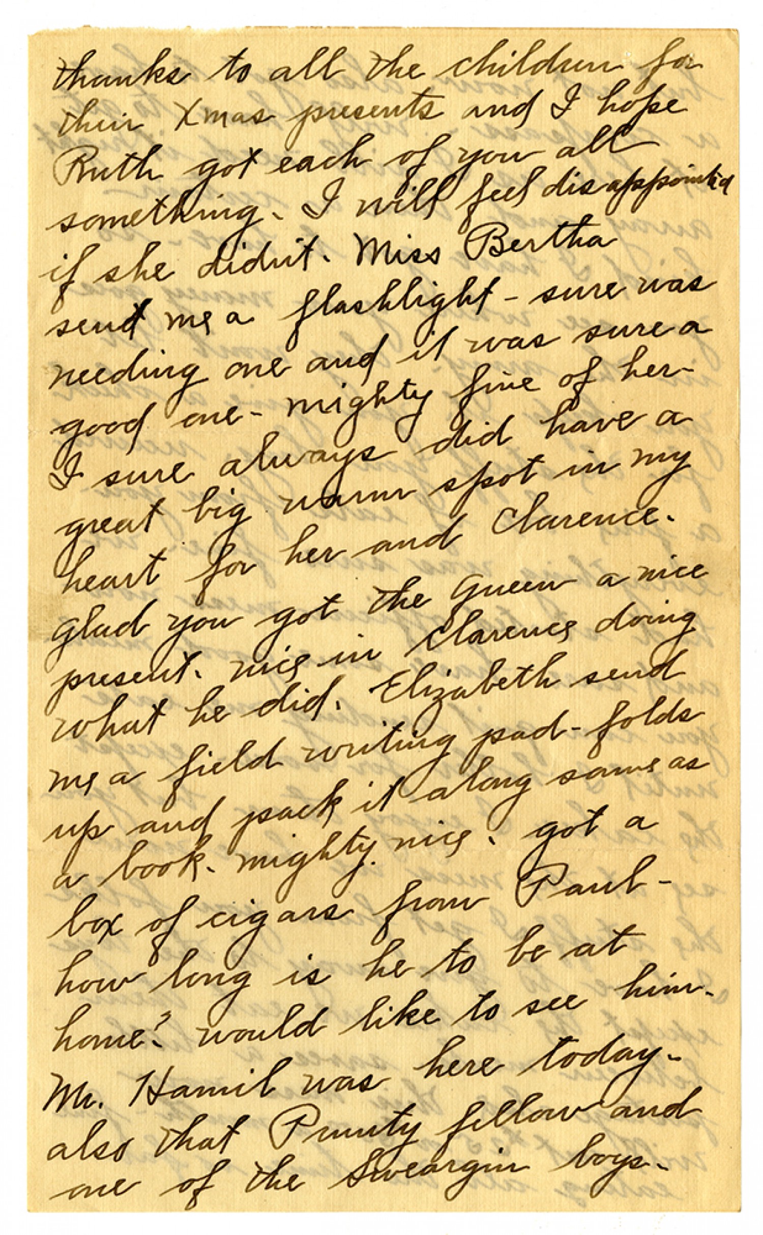 thanks to all the children for their Xmas presents and I hope Ruth got each of you all something. I will feel disappointed if she didn't. Miss Bertha sent me a flashlight - sure was needing one and it was sure a good one - mighty fine of her - I sure always did have a great big warm spot in my heart for her and Clarence. glad you got the queen a nice present. nice in Clarence doing what he did. Elizabeth send me a field writing pad - folds up and pack it along same as a book. mighty nice. got a box of cigars from Paul - how long is he to be at home? would like to see him. Mr. Hamil was here today. also that Prunty fellow and one of the Sweargin boys.