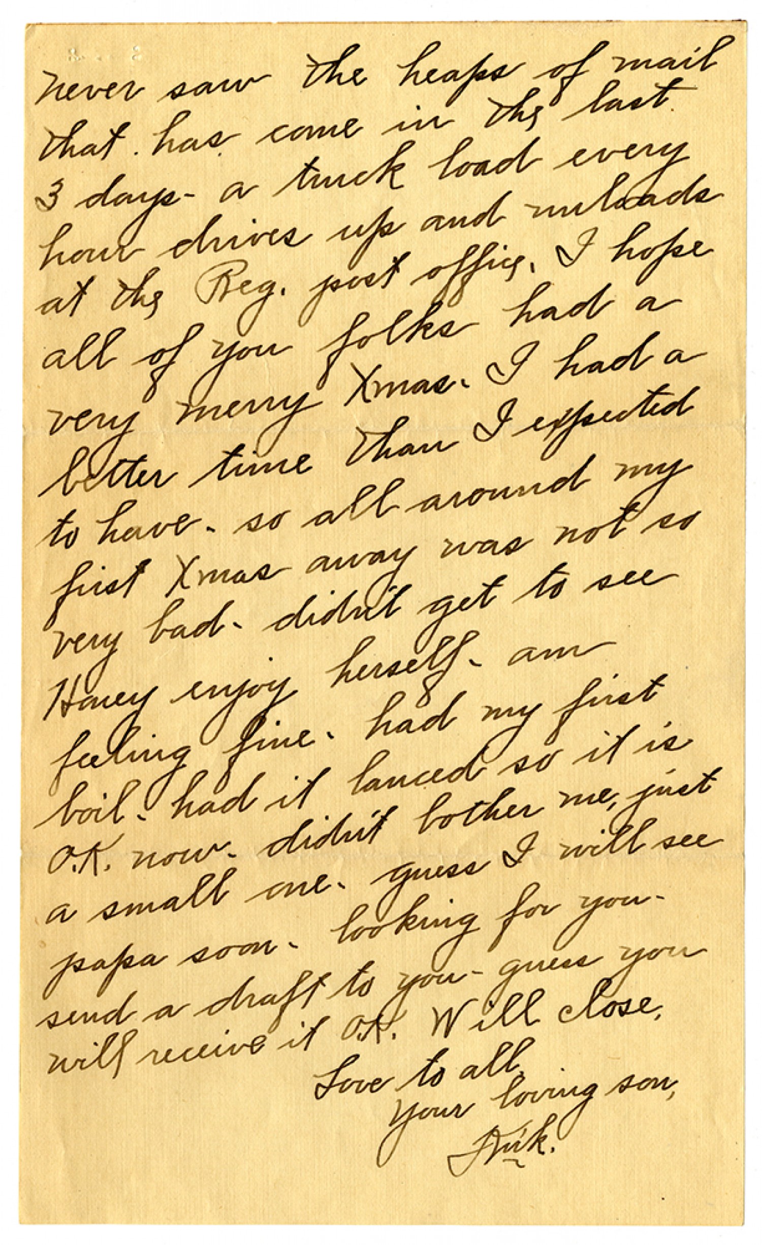 never saw the heaps of mail that has come in the last 3 days - a truck load every hour drives up and unloads at the Reg. post office. I hope all of you folks had a very merry Xmas. I had a better time than I expected to have. so all around my first Xmas away was not so very bad. didn't get to see Honey enjoy herself. am feeling fine. had my first boil. had it lanced so it is O.K. now. didn't bother me just a small one. guess I will see papa soon. lookign for you - send a draft to you - guess ou will receive it O.K. Will close, Love to all Your loving son, Kirk.