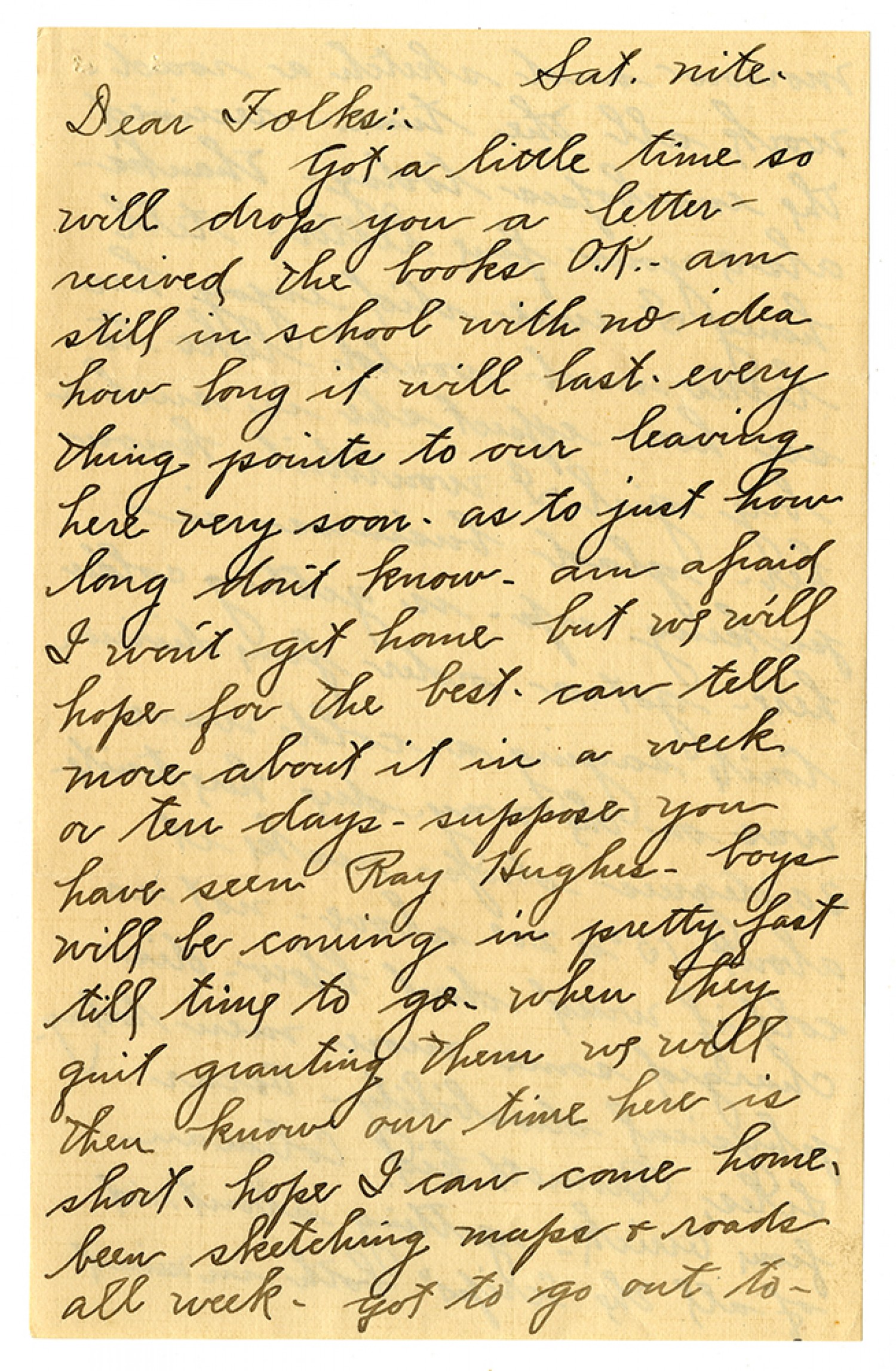 [Saturday] nite. Dear Folks: - Got a little time so will drop you a letter - received the books O.K. - am still in schoolwith no idea how long it will last. every thing points to our leaving here very soon. as to just how long don't know. am afraid I won't get home but we will hope for the best. can tell more about it in a week or ten days - suppose you have seen Ray Hughes - boys will be coming in pretty fast till time to go. when they quit granting them we will then know our time here is short. hope I can come home, been sketching maps & roads all week - got to go out to -