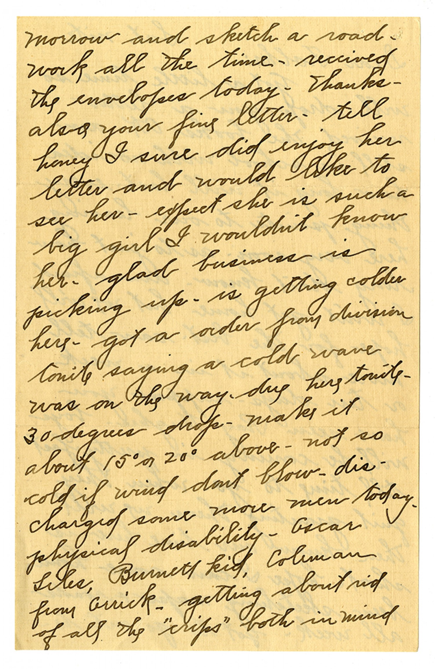 morrow and sketch a road - work all the time - received the envelopes today - thanks - also your fine letter - tell honey I sure did enjoy her letter and would like to see her - expect she is such a big girl I wouldn't know her. glad business is picking up - is getting colder here - got a order from division tonite saying a cold wave was on the way. due here tonite - 30 degrees drop - make it about 15 [degrees] or 20 [degrees] above - not so cold if wind ont blow - dis-charged some more men today. physical disability - Oscar Liles, Burnett kid, Coleman from Orrick - getting about rid of all the "crips" both in wind