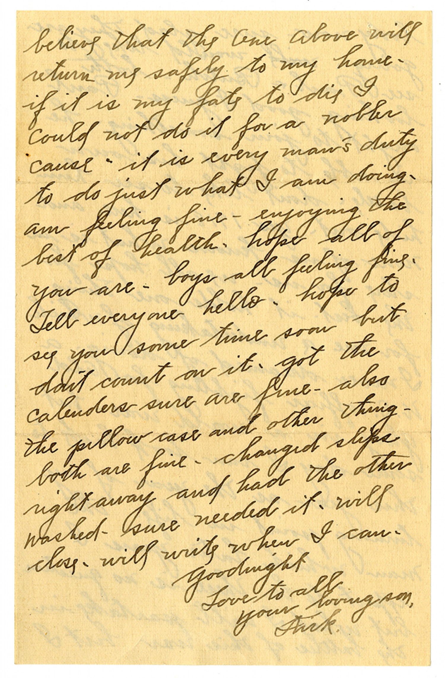 believe that the one above will return me safely to my home. if it is my fate to die I could not do it for a nobler cause - it is every man's duty to do just what I am doing - am feeling fine - enjoying the best of health. hope all of you are - boys all feeling fine. Tell every one hello. hope to see you some time soon but didn't count on it. got the calendars sure are fine - also the pillow case and other thing - both are fine - changed slips right away and had the other washed - sure needed it. will close - will write when I can. Goodnight Love to all Your loving son, Kirk.