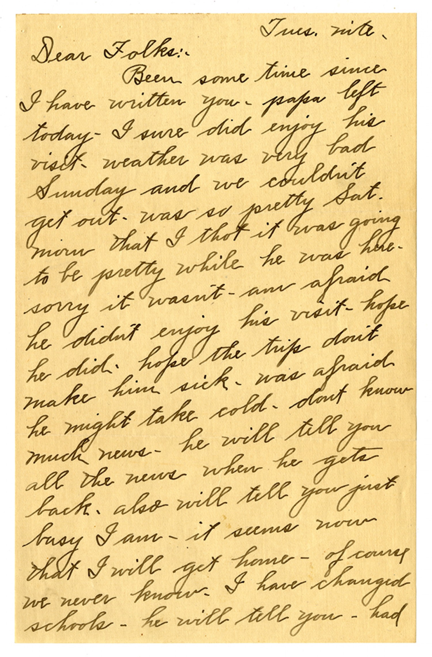 [Tuesday] nite, Dear Folks:- Been some time since I have written you - paper left today - I sure did enjoy his visit - weather was very bad Sunday and we couldn't get out - was so pretty [Saturday] morn that I thot it was going to be pretty while he was here. sorry it wasn't - am afriad he didn't enjoy his visit - hope he did. hope the trip don't make him sick - was afraid he might take cold - dont know much news - he will tell you all the news when he gets back. also will tell you just busy I am - it seems now that I will get home - of course we never know. I have changed schools - he will tell you - had