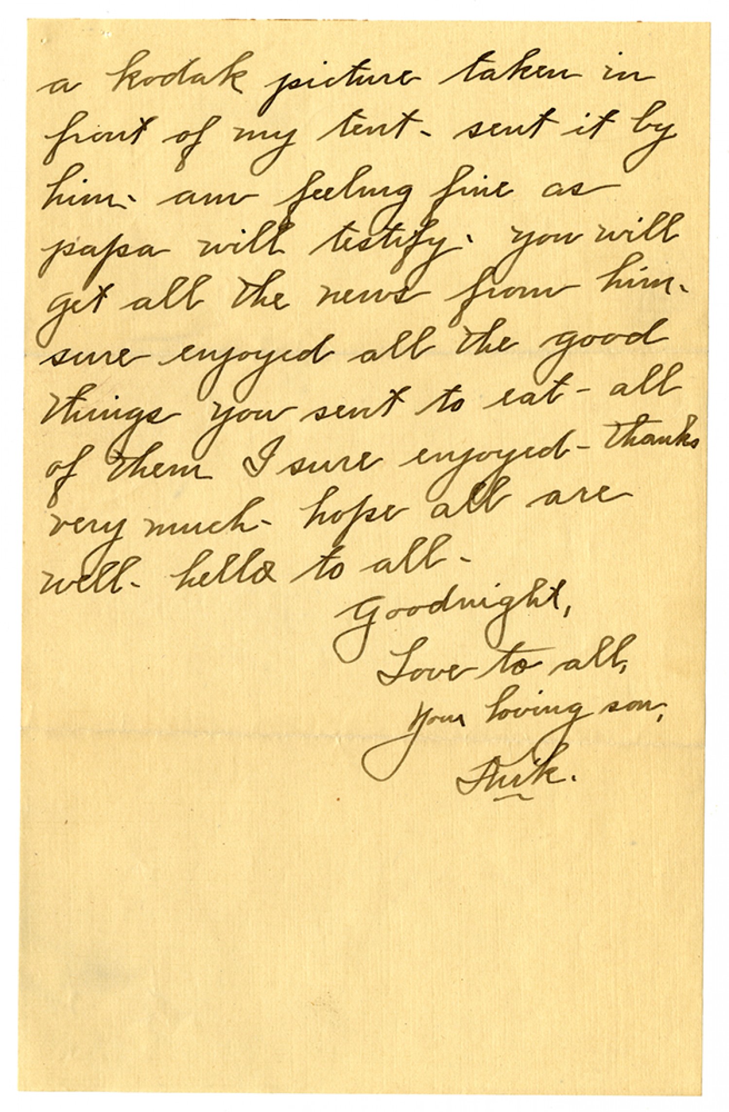 a kodak picture taken in front of my tent - sent it by him - am now feeling fine as papa will testify. you will get all the news from him. sure enjoyed all the good things you sent to eat - all of them I sure enjoyed - thanks very much - hope all are well - hello to all - Goodnight, Love to all, Your loving son, Kirk.