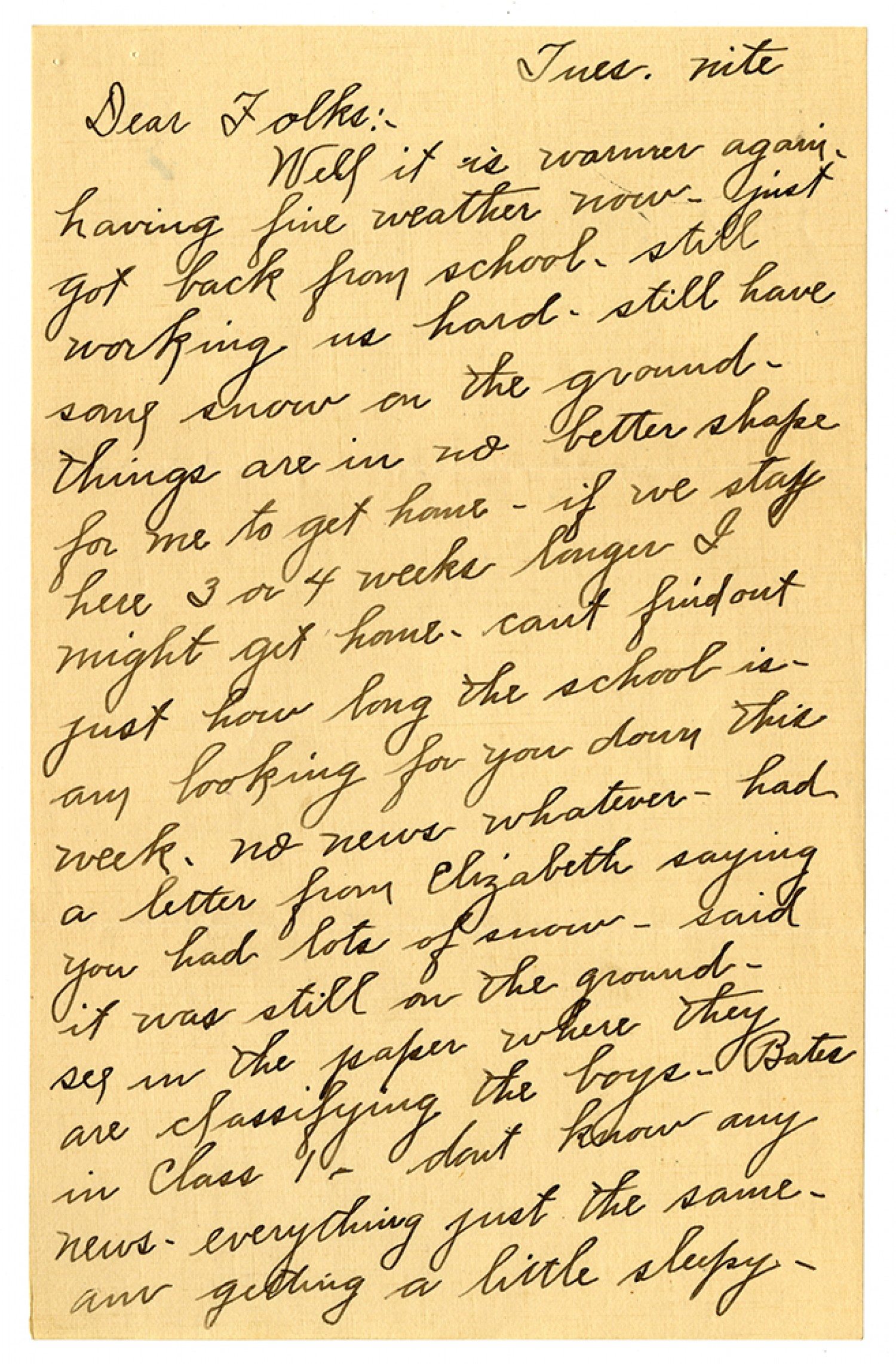 [Tuesday] nite Dear Folks:- Well it is warmer again - having fine weather now - just got back from school, still working us hard, still have some snow on the ground - things are in no better shape for me to get home - if we stay here 3 or 4 weeks longer I might get home, cant find out just how long the school is - am looking for you down this week, no news whatever - had a letter from Elizabeth saying you had lots of snow - said it was still on the ground - see in the paper where they are classifying the boys - Bates in class 1 - dont know any news - everything just the same - am getting a little sleepy -