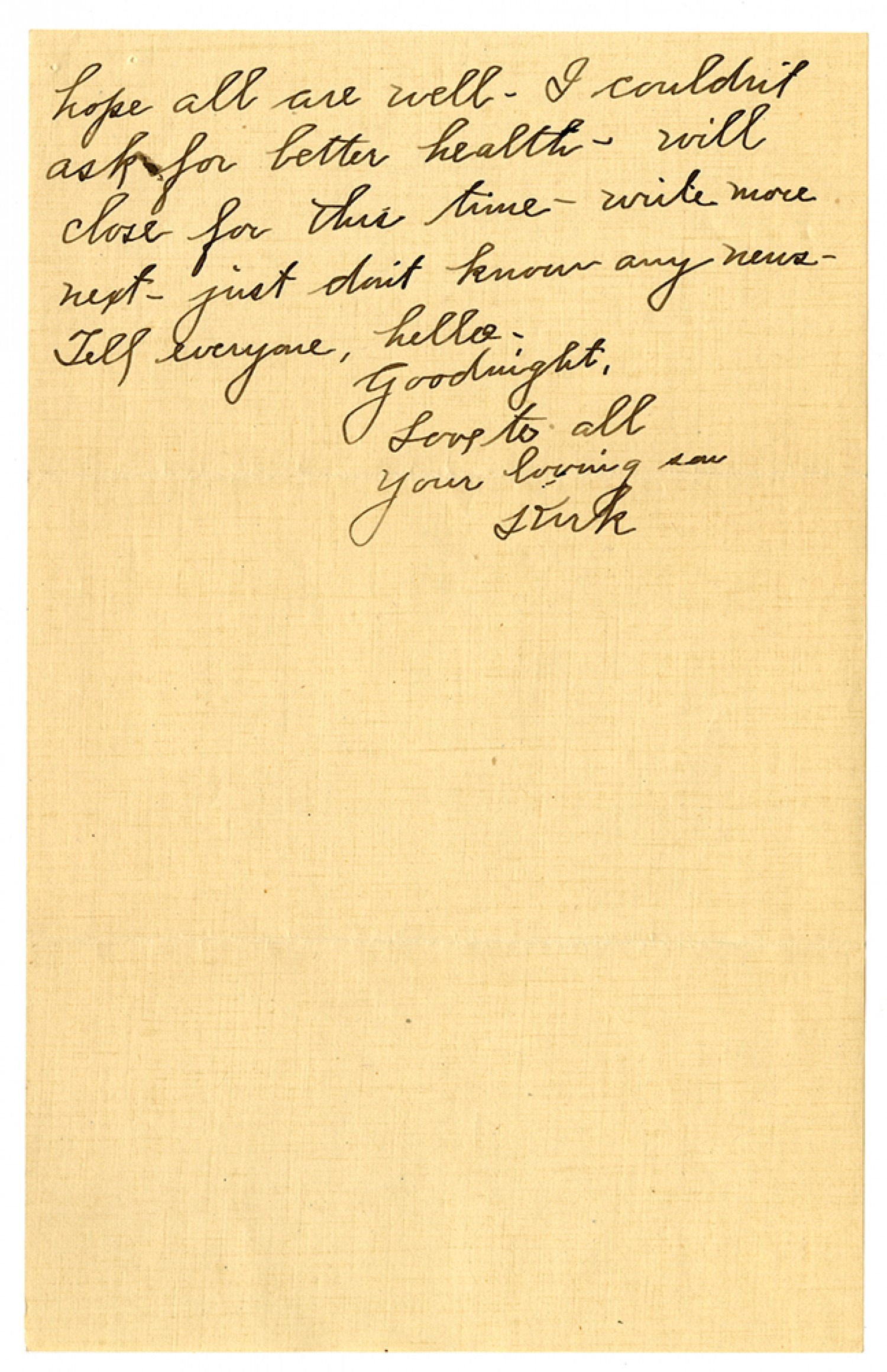 hope all are well - I couldn't ask for better health - will close for this time - write more next - just don't know any news - Tell everyone, hello - Goodnight, Love to all Your loving son Kirk