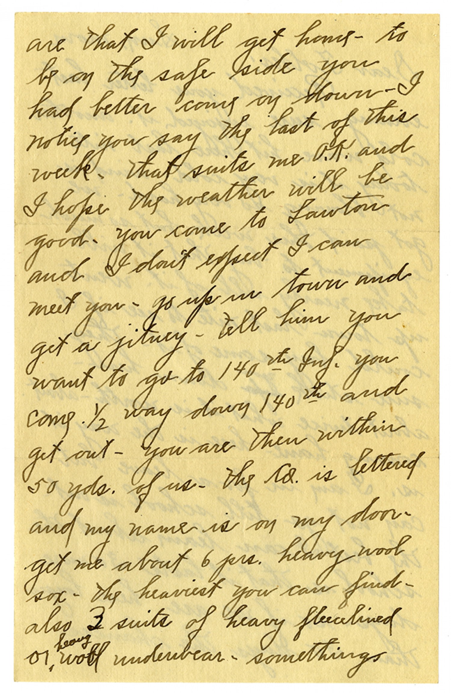 are that I will get home- to be on the safe side you had better come on down- I notice you say the last of this week - that suits me O.K. and I hope the weather will be good. you come to Lawton and I don't expect I can meet you - go up in town and get a [MS illegible: 1 wd] - tell him you want to go to 140th Inf. you come 1/2 way down 140th and get out - you are then within 50 yds. of us- the Co. is lettered and my name is on my door - get me about 6 prs. heavy wool sox - the heaviest you can find - also 3 suits of heavy fleecelined or heavy wool underwear - something