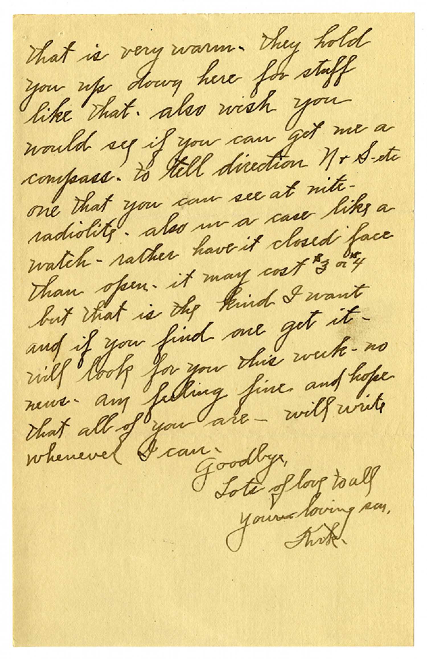that is very warm. they hold you up down here for stuff like that. also wish you would see if you can get me a compass. to tell direction N & S - etc one that you can see at nite - radiolite - also in a case like a watch - rather have it closed face than open - it may cost $3 or $4 but that is the kind I want and if you find one get it - will look for you this week - no news. am feeling fine and hope that all of you are - will write whenever I can, Goodbye, Lots of love to all Your loving son, Kirk.