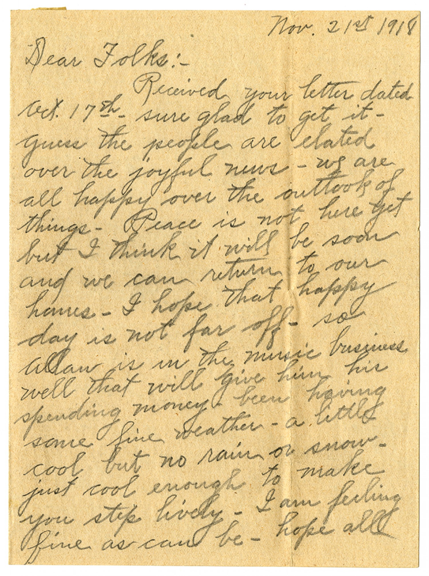 [November] 21st 1918 Dear Folks:- Received your letter dated [October] 17th sure glad to ge tit - guess the people are elated over the joyful news - we are all happy over the outlook of things - Peace is not here yet but I think it will be soon and we can return to our homes - I hope that happy day is not far off - so Allan is in the music business, well that will give him his spending money - been having some fine weather - a little cool but no rain or snow - just cool enough to make you step lively - I am feeling fine as can be - hope all