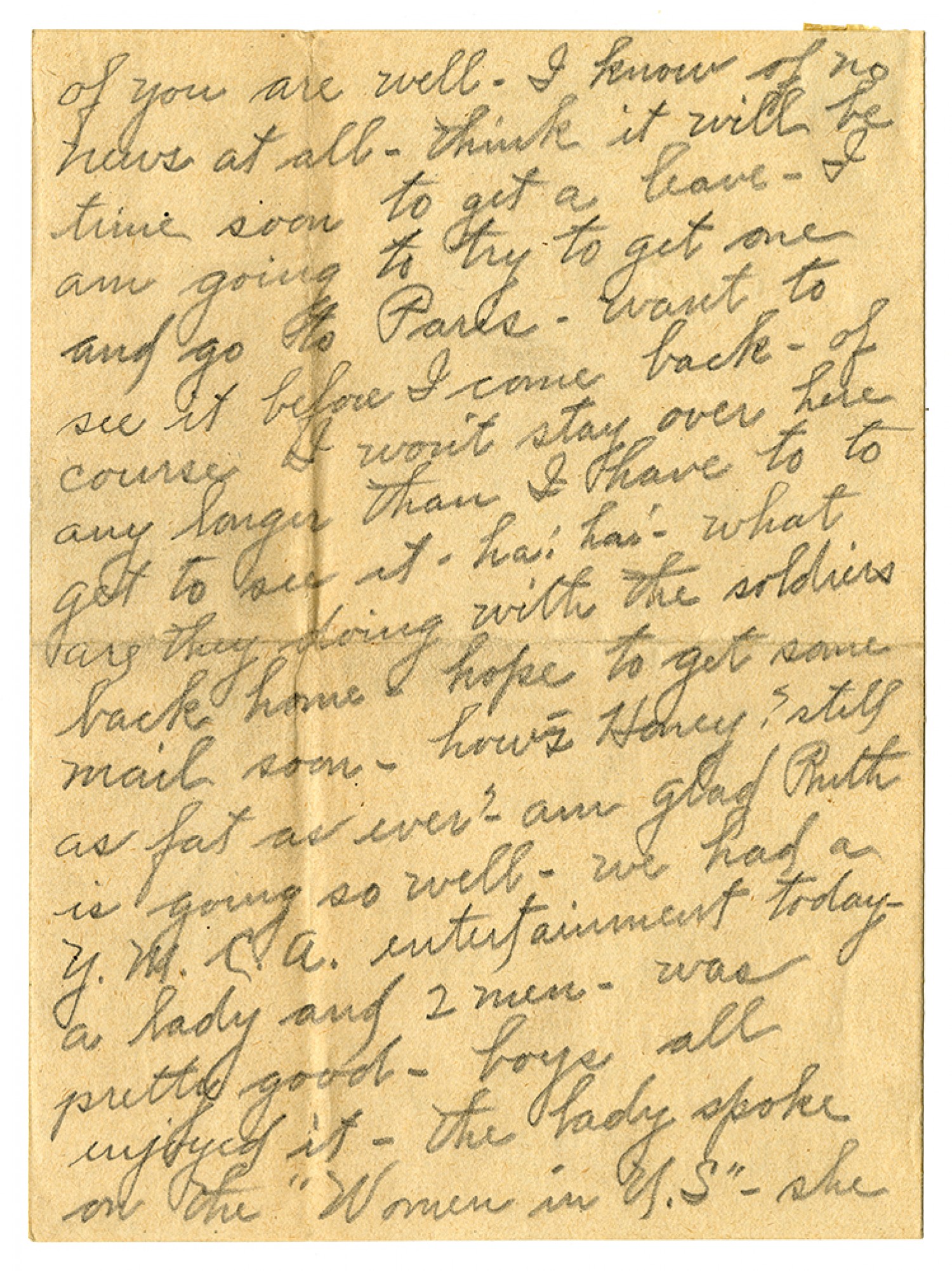 of you are well - I know of no news at all - think it will be the time soon to ge ta leave - I am going to try to get one and go to Paris - want to see it before I come back - of course I won't stay over here any longer than I have to to get to see it - ha! ha! - what are they doing with the soldiers back home - hope to get some mail soon - how's Honey? still as fat as ever? am glad Ruth is going so well - we had a Y.M.C.A. entertainment today - a lady and 2 men - was pretty good - boys all enjoyed it - the lady spoke on the "Women in U.S"- she