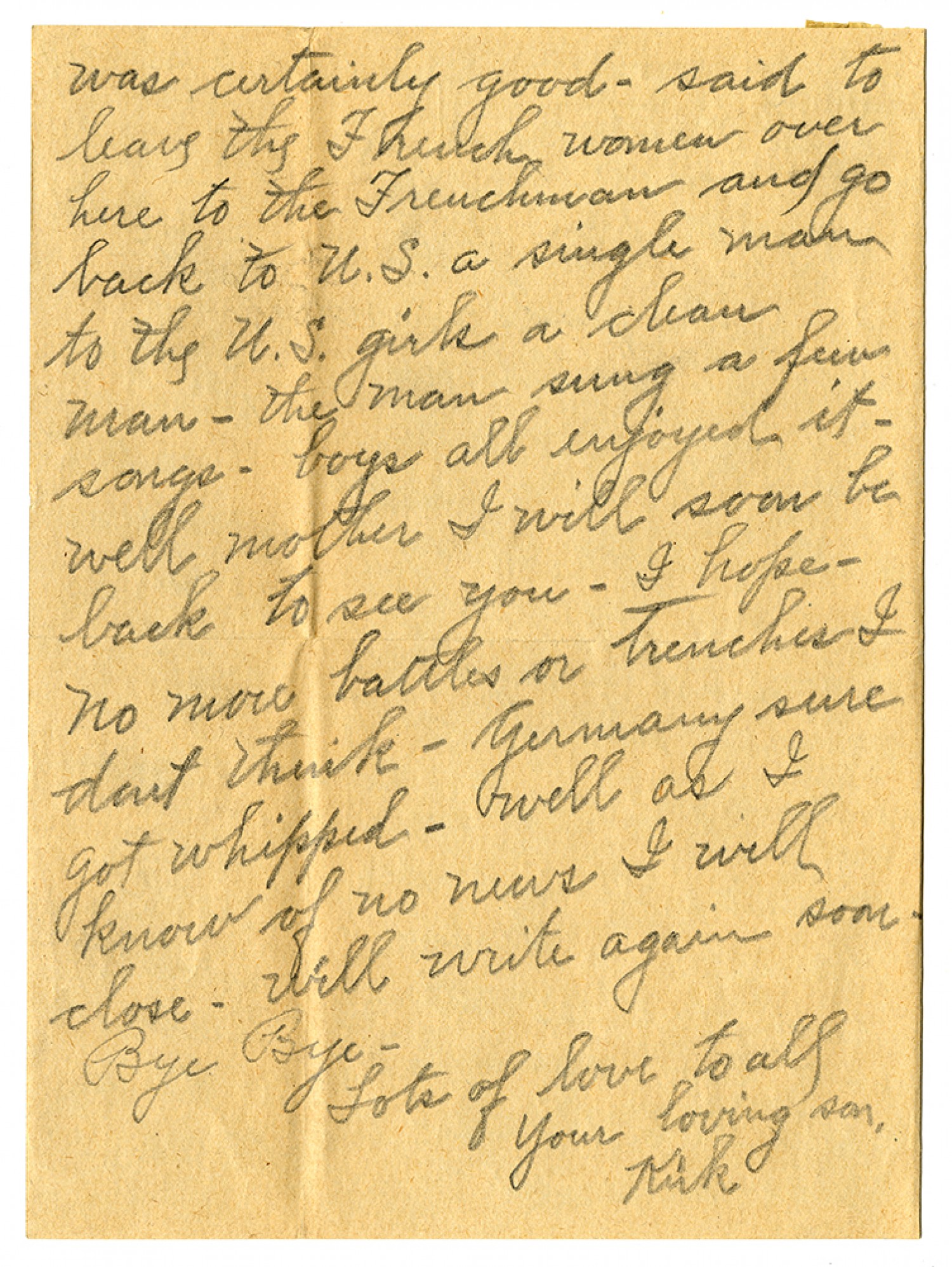 was certainly good - said to leave the French women over here to the Frenchman and go back to the U.S. a single man to the U.S. girls a clean man - the man sung a few songs - boys all enjoyed it- well mothe rI will soon be back to see you - I hope - no more battles or trenches I don't think - Germany sure got whipped - well as I know of no news I will close - will write again soon - Bye Bye - Lots of love to all Your loving son, Kirk