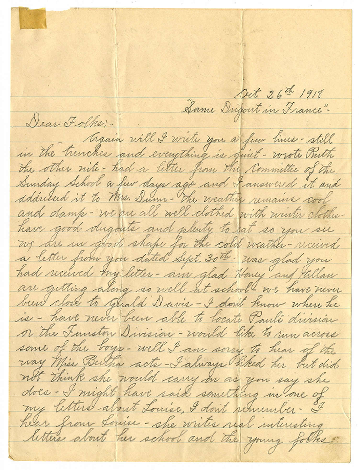 [October] 26th 1918 "Some Dugout in France" - Dear Folks:- Again will I write you a few lines - still in the trenches and everything is quiet - wrote Ruth the other nite - had a letter from the Committee of the Sunday School a few days ago and I answered it and addressed it to Mrs. Dunn - the weather remains cool and damp - we are all well clothed with winter clothes - have good dugouts and plenty to eat so you see we are in good shape for hte cold weather - received a letter from you dated [September] 30th - was glad you had received my letter - am glad Honey and Allan are getting along so well at school - we have neve rbeen close to Gerald Davis - I don't know where he is - have never been able to locate Paul's division or the Funston Division - would like to run across some of the boys - well I am sorry to hear of the way Miss Bertha acts - I always liked her but did not think she would carry on as you say she does - I ight have said something in one of my letters about Louise, I don't remember - I hear from Louise - she writes real interesting letters about her school and the young folks