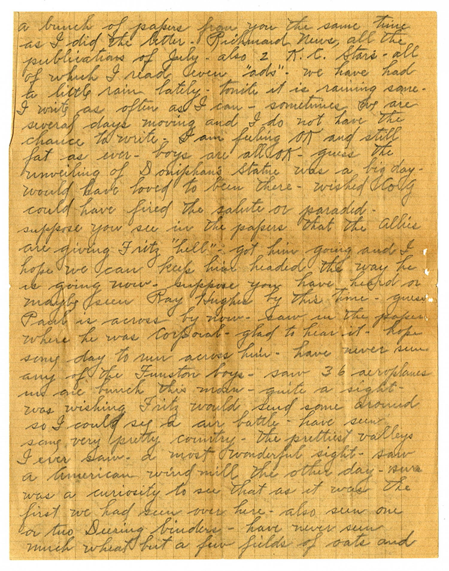 a bunch of papers from you the same time as I did the letter - Richmond News, all the publications of July - also 2 [Kansas City] Stars - all of which I read even "ads" - we have had a little rain lately - tonite it is raining some - I write as often as I can - sometimes we are several days moving and I do dnot have the chance to write - I am feeling OK and still fat as ever - boys are al lOK - guess the unveiling of Doniphan's Statue was a big day - would have loved to been there - wished Co G could have fired the salute or paraded - suppose you see in the papers that the Allies are giving Fritz "hell" - got him going and I hope we can keep him headed the way he is going now - suppose you have heard or maybe seen Ray Hughes by this time - guess Paul is across by now - saw in the papers where he was Corporal - glad to hear it- hope some day to run across him - have never seen any of the Funston boys - saw 36 aeroplanes in one bunch this morn - quite a sight - was wishing Fritz would send some around so I could see a air battle - have seen some very pretty country - the prettiest valleys I ever saw - a most wonderful sight - saw a American wind mill the other day - sure was a curiosity to see that as it was the first we had seen over here - also seen one or two Deering binders - have never seen much wheat but a few fields of oats and