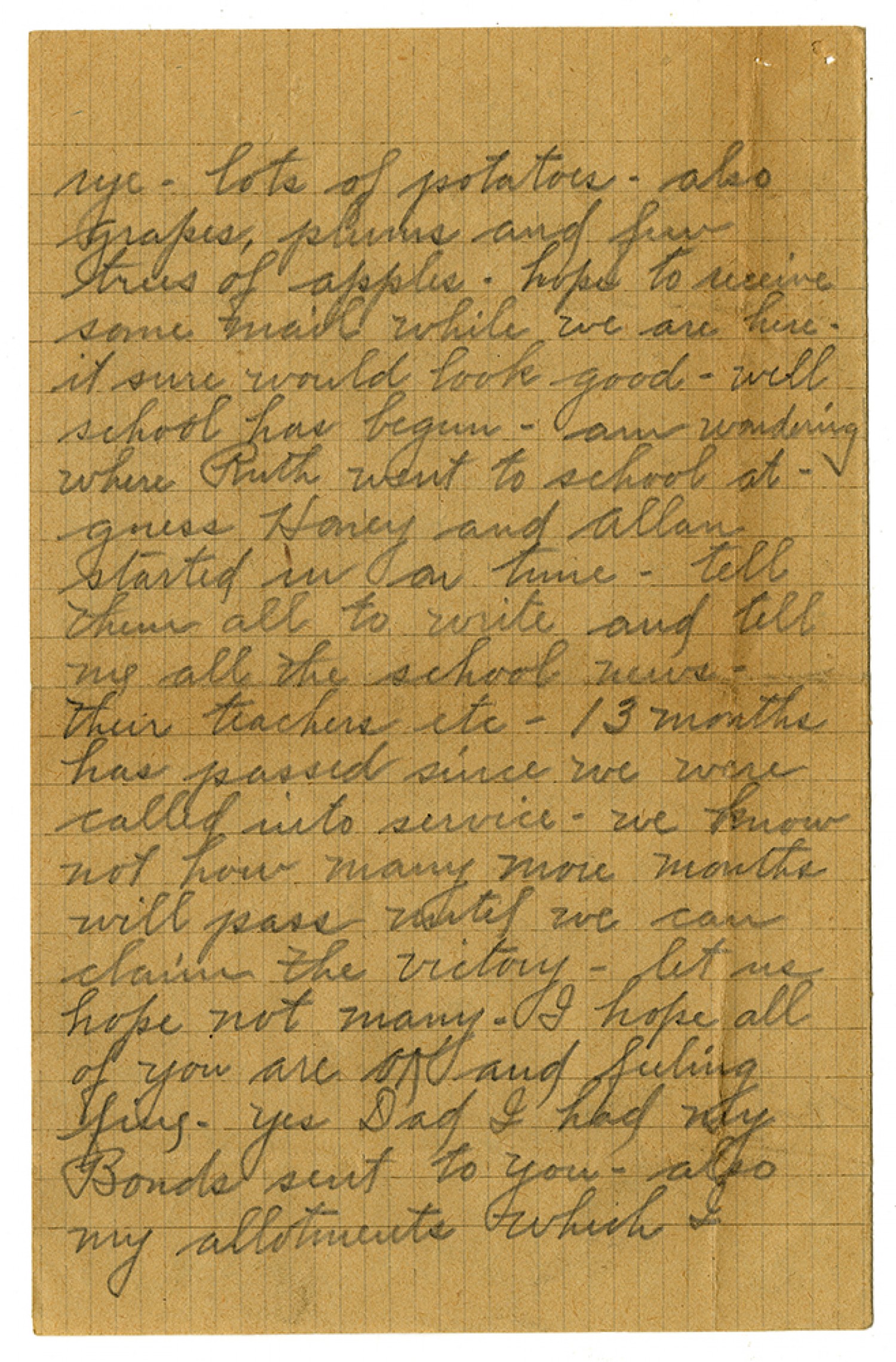 rye - lots of potatoes - also grapes, plums and few trees o fapples - hope to receive some mail while we are here. it sure would look good - well school has begun - am wondering where Ruth went to school at - guess Honey and Allan started in on time - tell them all to write and tell me all the school news - their teachers etc - 13 months has passed since we were called into service - we know not how many more months will pass until we can claim the victory - let us hope not many - I hope all of you are OK and feeling fine - yes Dad I had my Bonds sent to you - also my allotments which I