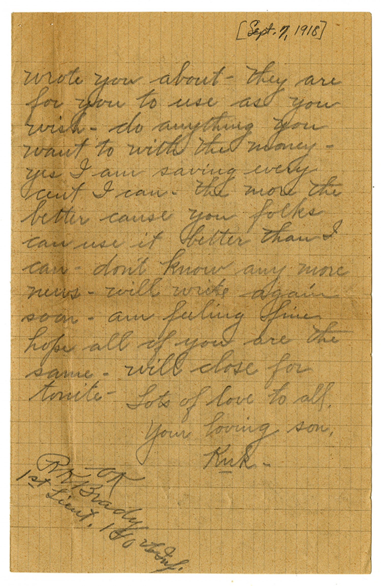 Robert Kirk Brady letter to Folks - September 7, 1918