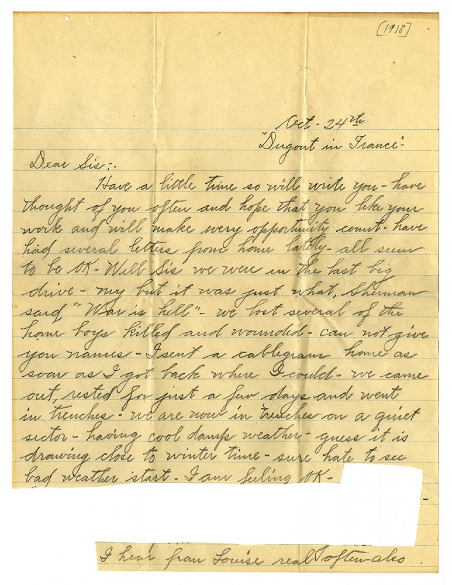 [October 24, 1918] "Dugout in France-" Dear Sis:- Have a little time so will write you - have thought of you often and hope that you like your work and will make every opportunity count - have had several letters from home lately - all seem to be OK - Well Sis we were in the last big drive - my but it was just what, Sherman said "War is hell" - we lost several of the home boys killed and wounded - can not give you names - I sent a cablegram home as soon as I got back where I could - we came out, rested for just a few days and went in trenches - we are now in trenches on a quiet sector - having cool damp weather - guess it is drawing close to winter time - sure hate to see bad weather start - I am feeling OK -[MS illegible] I hear from Louise real often also