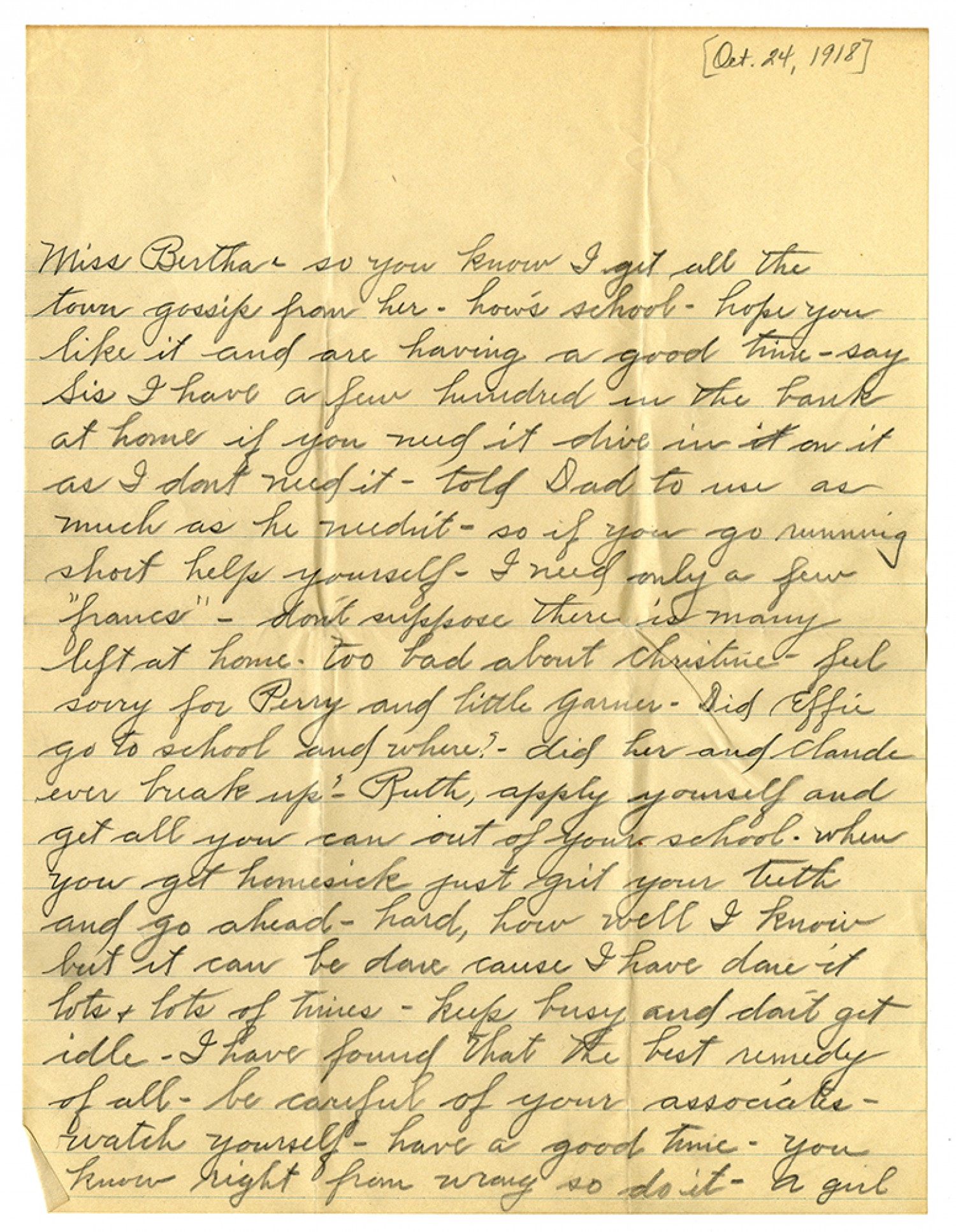 Miss Bertha - so you know I get all the town gossip from her - how's school - hope you like it and are having a good time - say Sis I have a few hundred in the bank at home if you need it dive in on it as I dont need it - told Dad to use as much as he needn't - so if you are running short help yourself - I need only a few "francs" - don't suppose there is marry left at home. too bad about Christine - feel sorry for Perry and little Garner - Did Effie go to school and where? - did her and Claude ever break up? - Ruth, apply yourself and get all you can out of your school - when you get homesick just grit your teeth and go ahead - hard, how well I know but it can be done cause I have done it lots & lots of times - keep busy and don't get idle - I have found that the best remedy of all - be careful of your associates - watch yourself - have a good time - you know right from wrong so do it - a girl