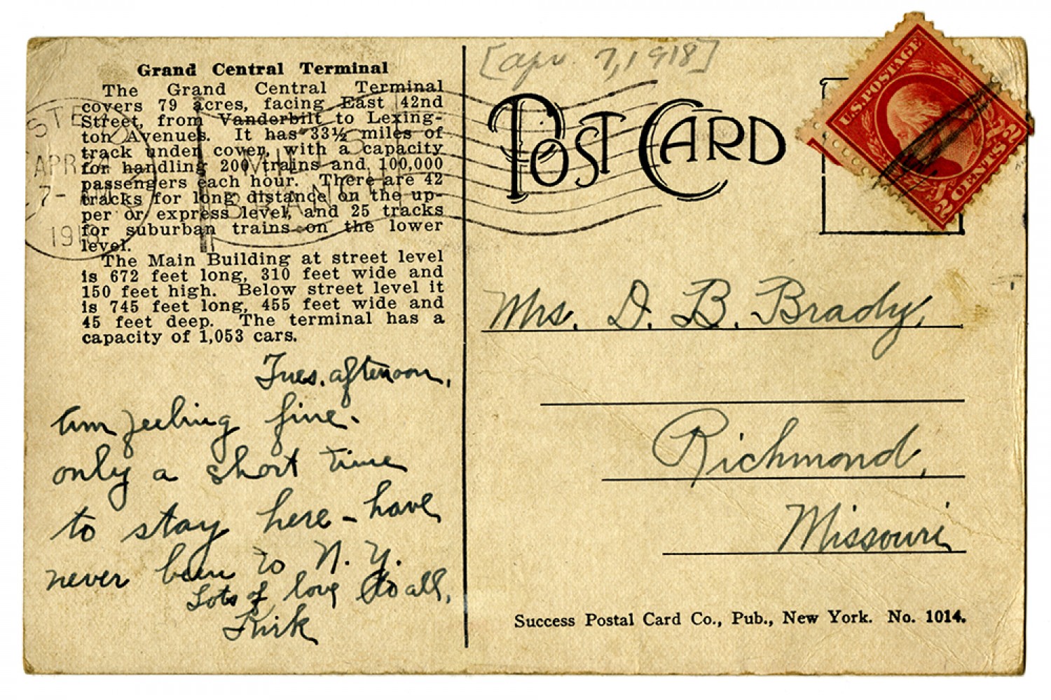 [April 7, 1918] [Tuesday] afternoon. Im feeling fine. only a short time to stay here - have never been to N.Y. Lots of love to all, Kirk Mrs. D.B. Brady, Richmond, Missouri