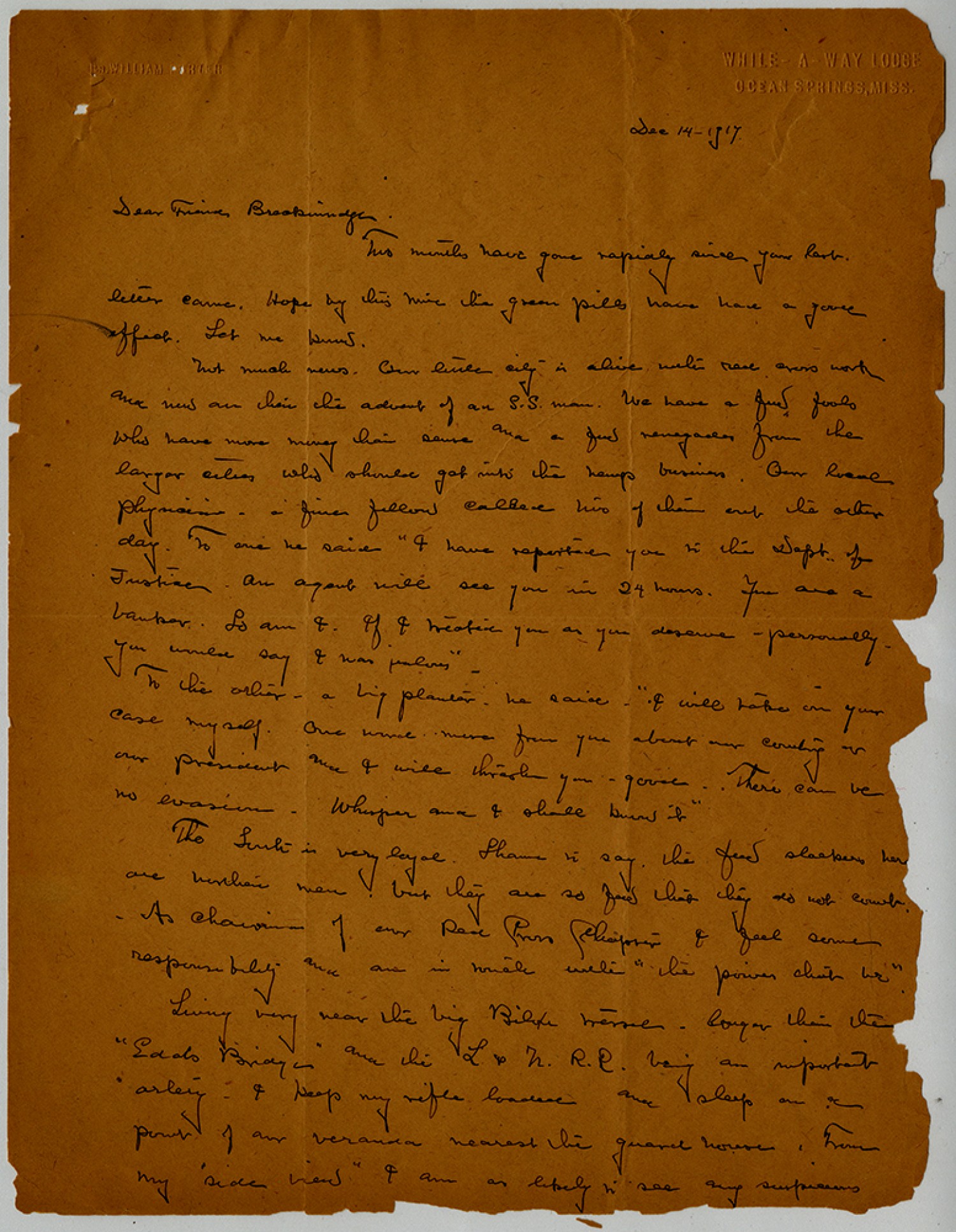 DR. WILLIAM PORTER WHILE-A-WAY LODGE OCEAN SPRINGS, [Mississippi] [December 14, 1917]. Dear Friend Breckenridge. Two months have gone rapidly since your last letter came. Hope by this time the green pills have had a good affect. Let me know. Not much news. Our little city is alive [ms illegible: 3 wds] work and new [ms illegible: 4 wds] of an S.S. man. We have a few fools who have more money than sense and a few renegades from the larges cities who should get into the hemp business. Our local physician - a fine fellow called [ms illegible: 1 wd] of [ms illegible: 1 wd] out the other day. To one he said "I have reported you to the Dept. of Justice an agent will see you in 24 hours. You are a bank. So am I. If I treated you as you deserve -personally- you would say I was jealous". To the [ms illegible: 1 wd] - a big planter - he said - "I will take on your case myself. One word more from you about our country of our president and I will trash you - good. There can be no evasion. Whisper and I shall know it" The South is very loyal. Shame to say the few sleepers here are [ms illegible: 1 wd] men but they are so few that they do not count. As chairman of our Red Cross Chapter I feel some responsibility and am in [ms illegible: 2 wds] "the power that be". Living very near the big Biloxi [ms illegible: 1 wd] long than the "Eads Bridge" and the L & N R.R. being an important artery I keep my rifle loaded and sleep on a [ms illegible: 1 wd] of our veranda nearest the guard house. From my "side view" I am as likely to see any suspicious