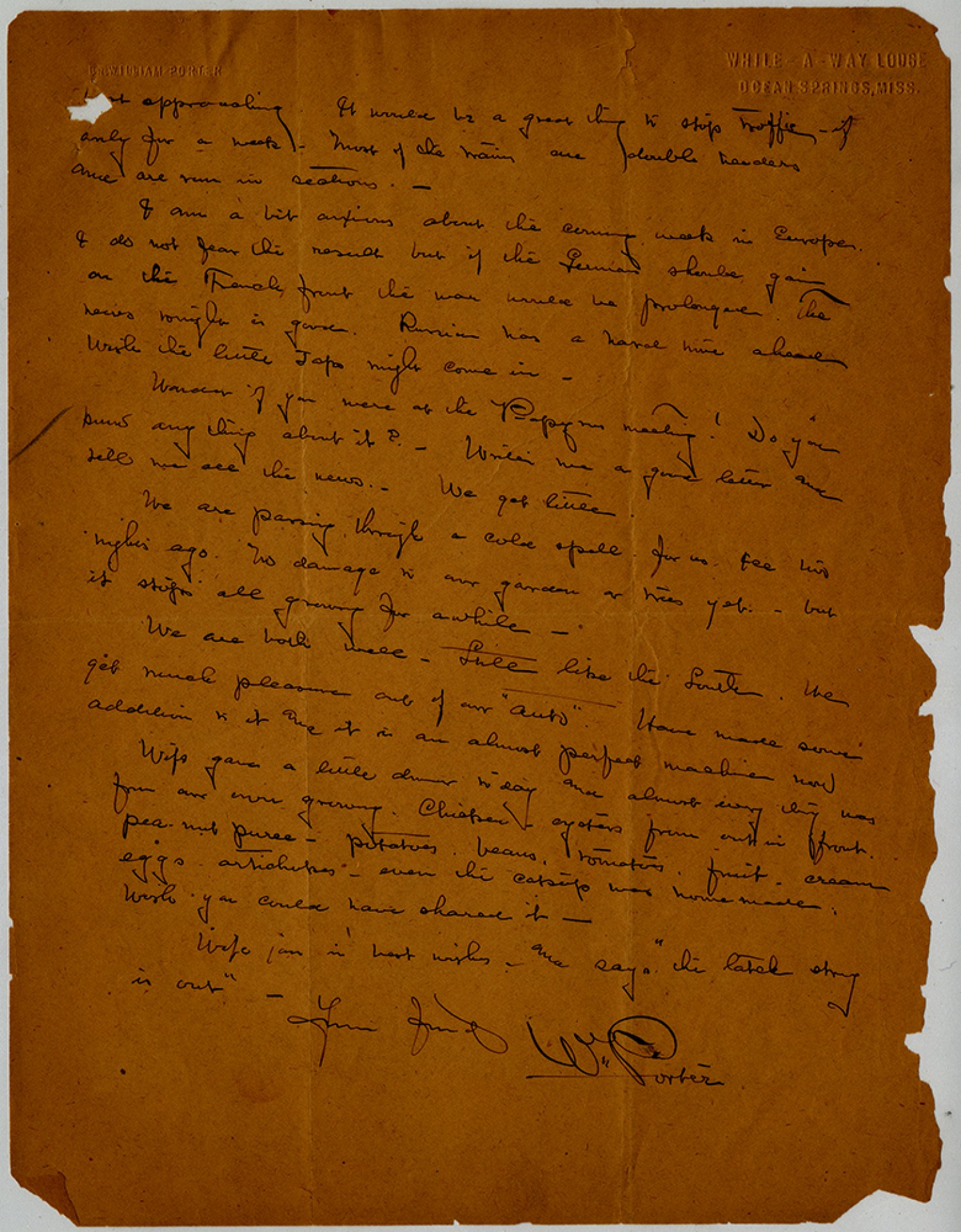 [ms illegible: 1 wd] approaching. It would be a great thing to stop traffic if only for a week. Most of the trains are double headers and are run in sections. - I am a bit anxious about the coming week in Europe. I do not fear the result but if the Germans should gain on the French front the war would be prolonged. The news tonight is good. Russia has a hard time ahead [ms illegible: 1 wd] the little Japs might come in. Wonder if you were at the Papyrus meeting! Do you know any thing about it? - Write me a good letter and tell me all the news. We get little. We are passing through a cold spell for us. Ice two nights ago. No damage to our garden or trees yet - but it stops all growing for a while. We are both well. Still like the South. We get much pleasure out of our "auto". Have made some addition to it and it is an almost perfect machine now. Wife gave a little dinner to day and almost every thing was from our own growing. Chicken - oysters from out in front, pea-nut puree - potatoes, beans, tomatoes, fruit, cream eggs artichokes - even the catsup was homemade. Wish you could have shared it - Wife joins in best wishes and says "the latch story is out" - Your friend [William] Porter