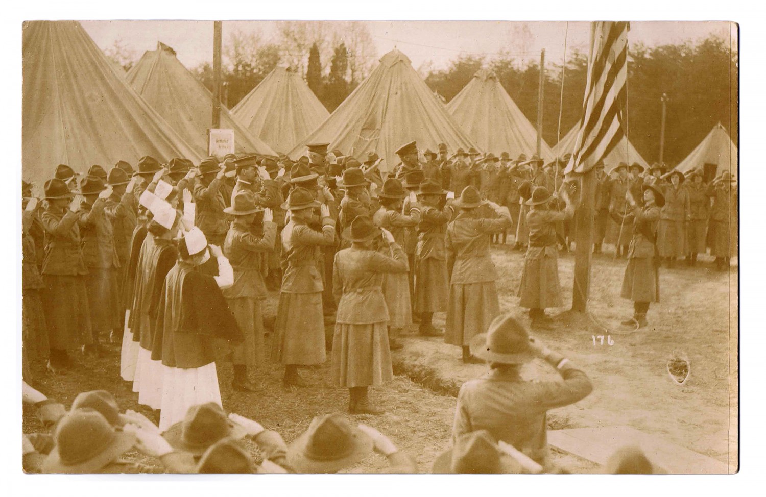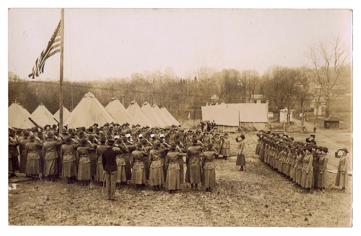 | Description | This is a photograph of companies saluting the flag at the National Service school. In the summer of 1916 and spring of 1917 Carrie P. Bribach attended the National Service School, which was formed in 1915 by the Women |