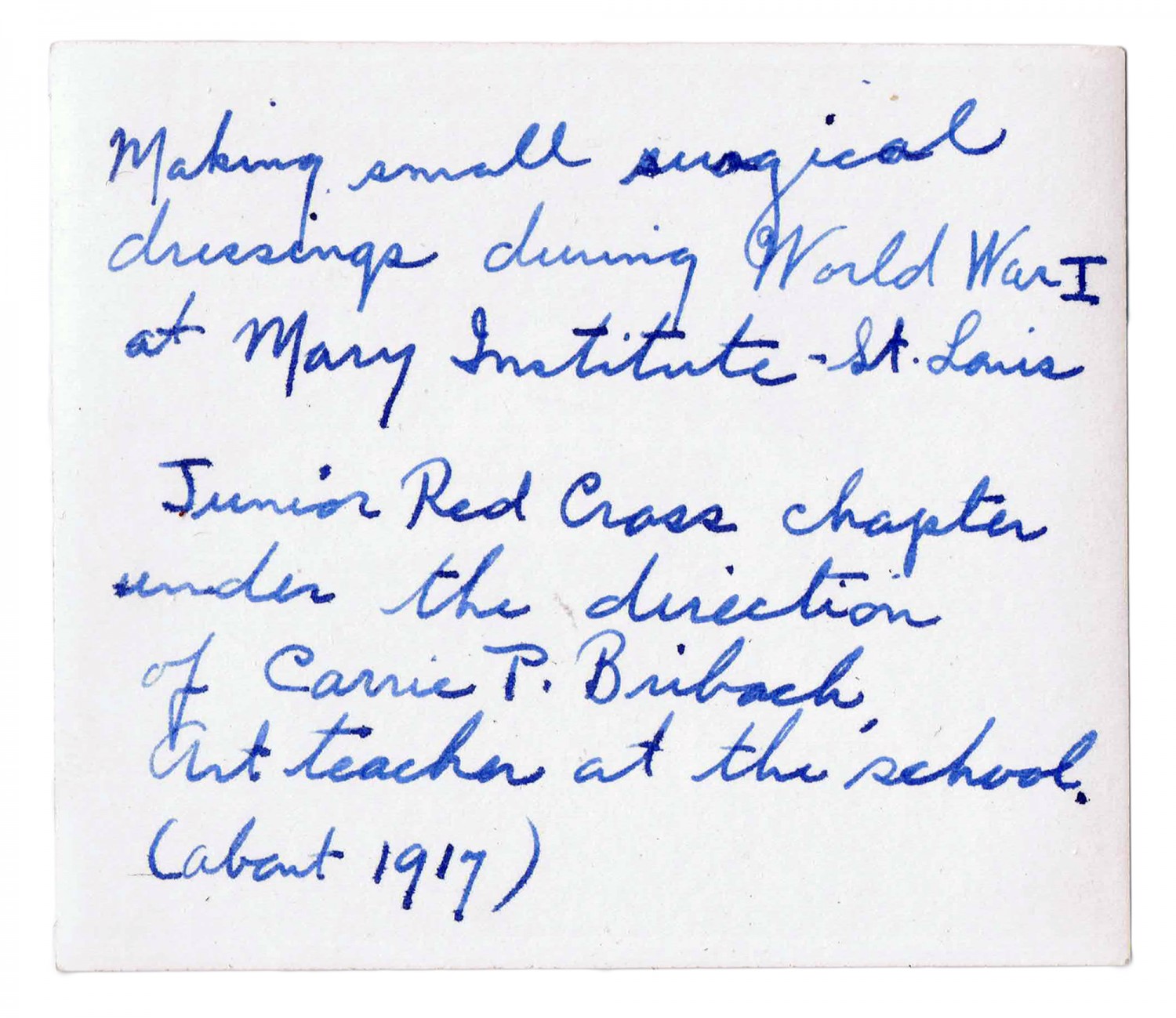 | Description | This is a photograph of students of the Mary Institute, where Carrie P. Bribach taught art, making small surgical dressings during World War I. The students were also members of a Junior Red Cross chapter. |