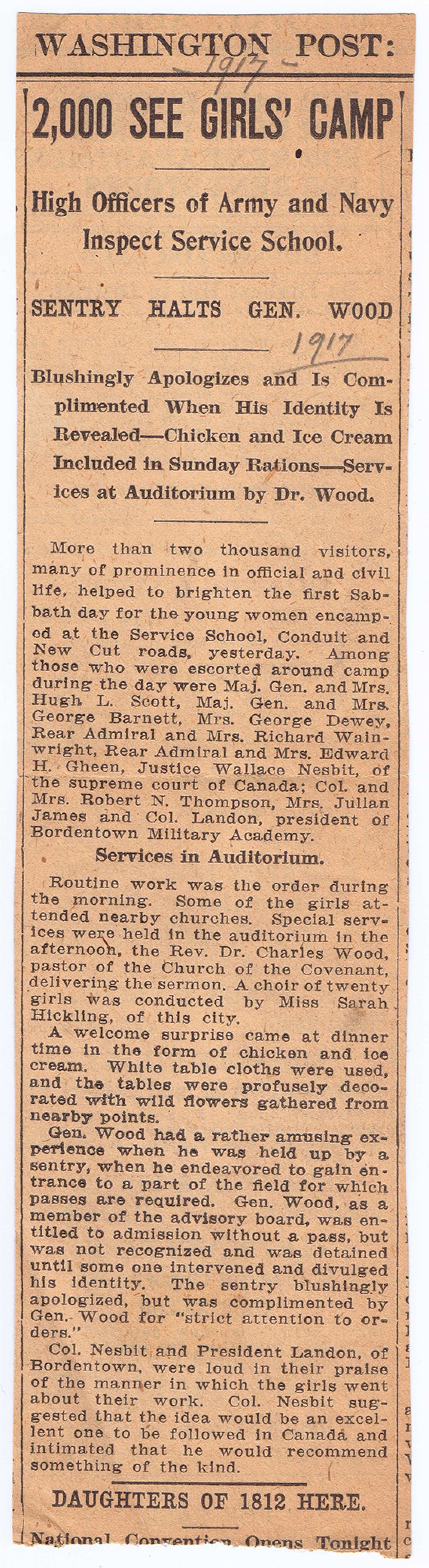 WASHINGTON POST: 1917 2,000 SEE GIRLS' CAMP High officers of Army and Navy Inspect Service School. Sentry Halts Gen. Wood Blushingly Apologizes and Is Complimented When His Identity Is Revealed - Chicken and Ice Cream Included in Sunday Rations - Services at Auditorium by Dr. Wood. More than two thousand visitors, many of prominence in official and civil life, helped to brighten the first Sabbath day for the young women encamped at the Service School, Conduit and New Cut roads, yesterday. Among those who were escorted around camp during the day were Maj. Gen. and Mrs. George Barnett, Mrs. George Dewey, Rear Admiral and Mrs. Richard Wainwright, Rear Admiral and Mrs. Edward H. Gheen, Justice Wallace Nesbit, of the supreme court of Canada; Col. and Mrs. Robert N. Thompson, Mrs. Julian James and Col. Landon, president of Bordentown Military Academy. Services in Auditorium. Routine work was the order during the morning. Some of the girls attended nearby churches. Special services were held in the auditorium in the afternoon, the Rev. Dr. Charles Wood, pastor of the Church of the Covenant, delivering the sermon. A choir of twenty girls was conducted by Miss Sarah Hickling, of this city. A welcome surprise came at dinner time in the form of chicken and ice cream. White table cloths were used and the tables were profusely decorated with wild flowers gathered from nearby points. Gen. Wood had a rather amusing experience when he was help up by a sentry, when he endeavored to gain entrance to a part of the field for which passes are required. Gen. Wood, as a member of the advisory board, was entitled to admission without a pass, but was not recognized and was detained until some one intervened and divulged his identity. The sentry blushingly apologized, but was complimented by Gen. Wood for "strict attention to orders." Col. Nesbit and President Landon, of Bordentown, were loud in their praise of the manner in which the girls went about their work. Col. Nesbit suggested that the idea would be an excellent one to be followed in Canada and intimated that he would recommend something of the kind.