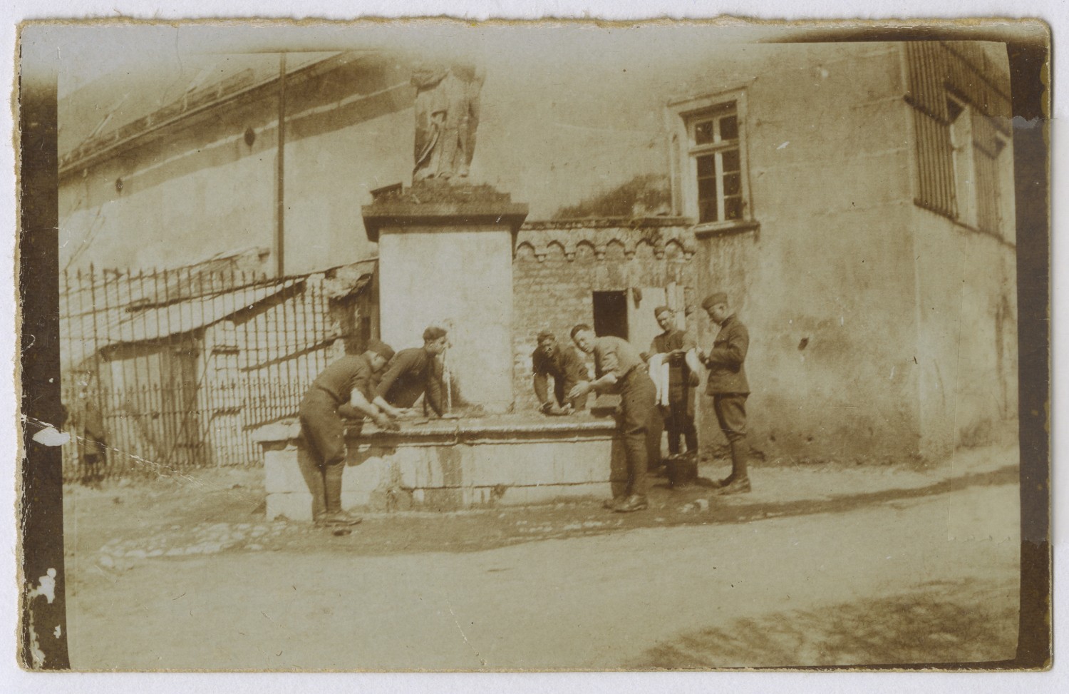32nd Division men drink and wash in a fountain