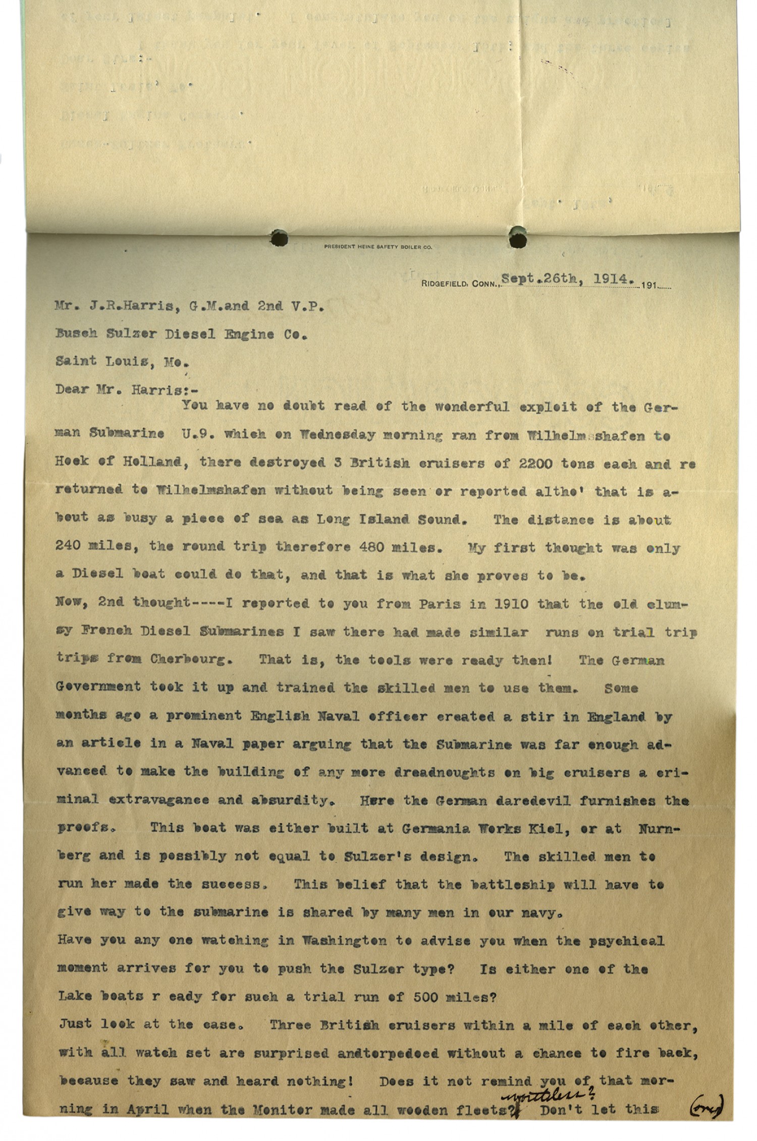 [September 26, 1914] Mr. J.R.Harris, G.M.and 2nd V.P. Busch Sulzer Diesel Engine Co. Saint Louis, [Missouri] Dear Mr. Harris:- You have no doubt read of the wonderful exploit of the German Submarine U.9. which on Wednesday morning ran from Wilhelmshafen to Hook of Holland, there destroyed 3 British cruisers of 2200 tons each and re returned to Wilhelmshafen without being seen or reported altho that is about as busy a piece of sea as Long Island Sound. The distance is about 240 miles, the round trip therefore 480 miles. My first thought was only a Diesel boat could do that, and that is what she proves to be. Now, 2nd thought----I reported to you from Paris in 1910 that the old clumsy French Diesel Submarines I saw there had made similar runs on trial trip trips from Cherbourg. That is, the tools were ready then! The German Government took it up and trained the skilled men to use them. Some months ago a prominent English Naval officer created a stir in England by an article in a Naval paper arguing that the Submarine was far enough advanced to make the building of any more dreadnoughts on big cruisers a criminal extravagance and absurdity. Here the German daredevil furnishes the proofs. This boat was either built at Germania Works Kiel, or at Nurnberg and is possibly not equal to Sulzer